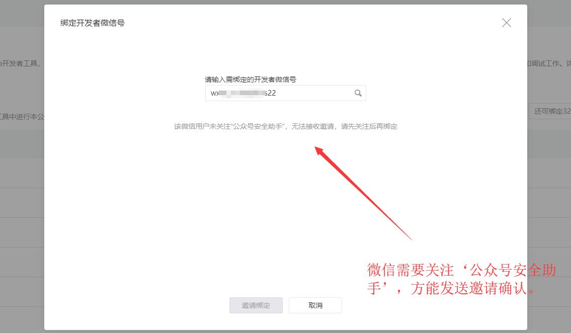 绑定用户成为微信公众平台(即服务号)的开发者,微信用户要先关注“公众平台安全助手”和关注商城公众号,方能进行下方的绑定操作。