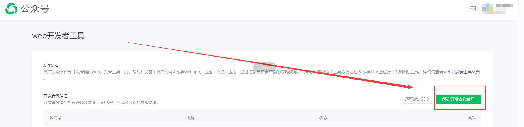 进入微信公众号:mp.weixin.qq.com ,在微信公众号左侧菜单 设置与开发 — 开发接口管理  — 开发者工具 — web开发者工具,如下图所示。