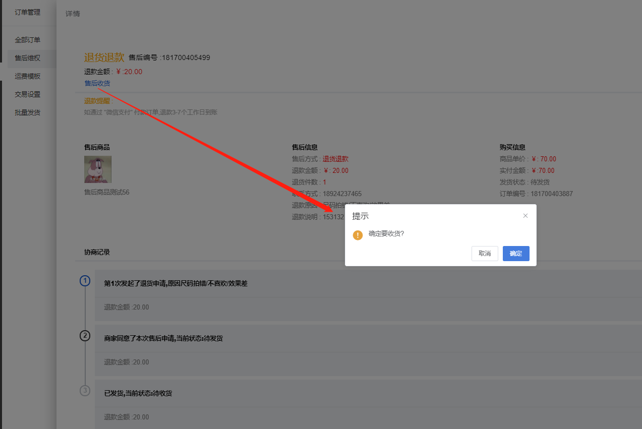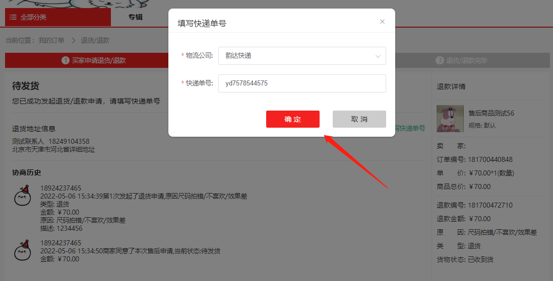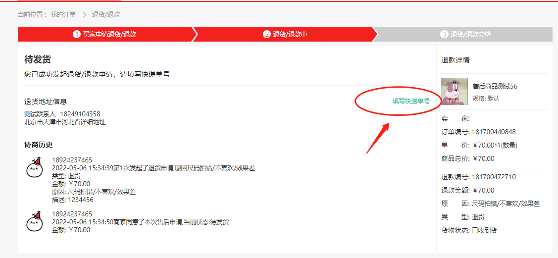 3.申请仅退款的等商家审核退款即可,若是申请退货退款的,等商家审核通过后,需要寄回商品,填写物流信息,寄寄回后,等商家收货,验货后确认退款。