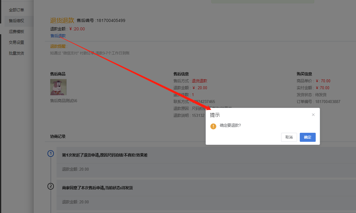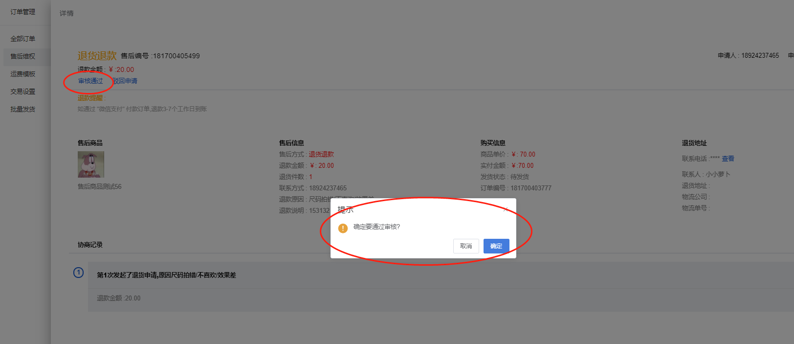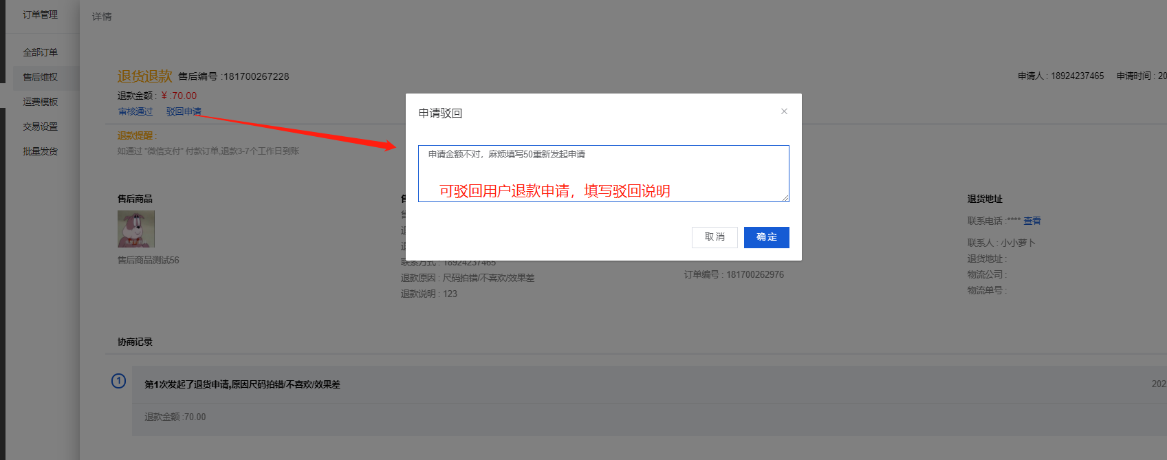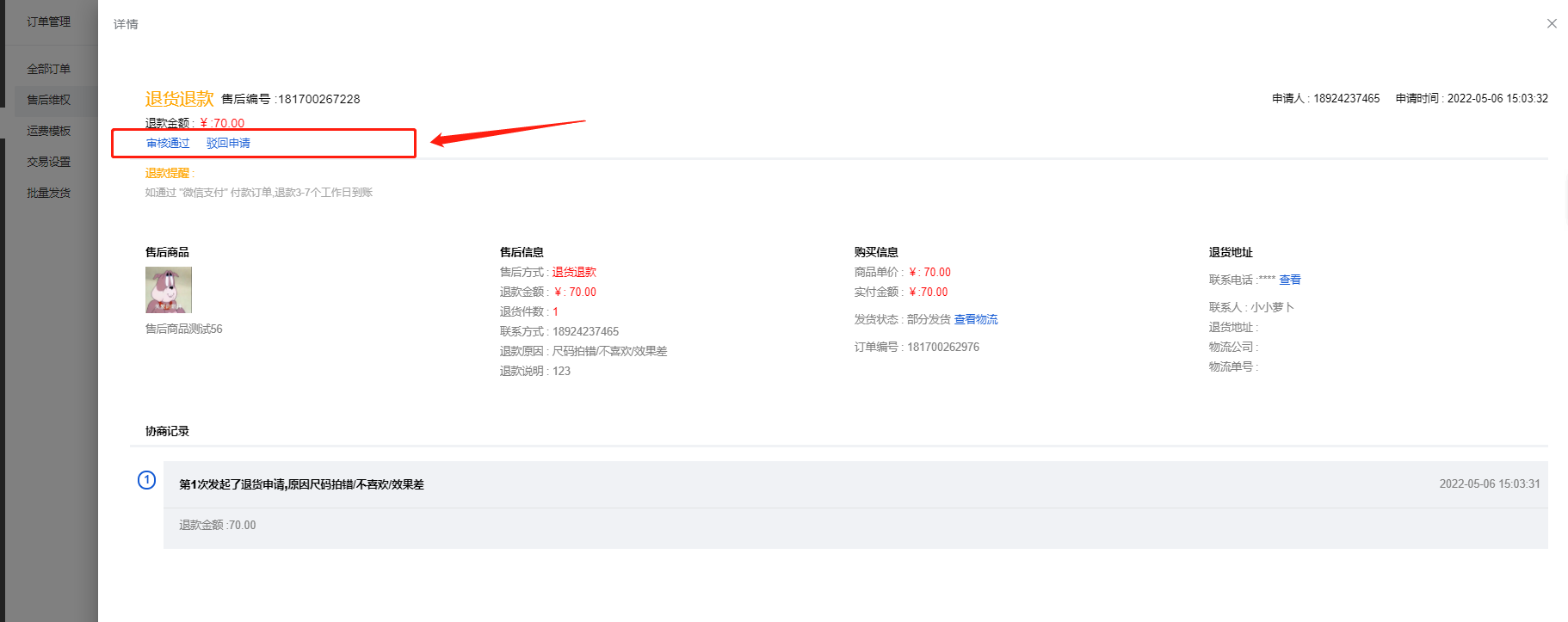 4.进入详情可查看退款信息,可操审核通过退款申请,或者驳回(驳回用户可以重新申请退款)