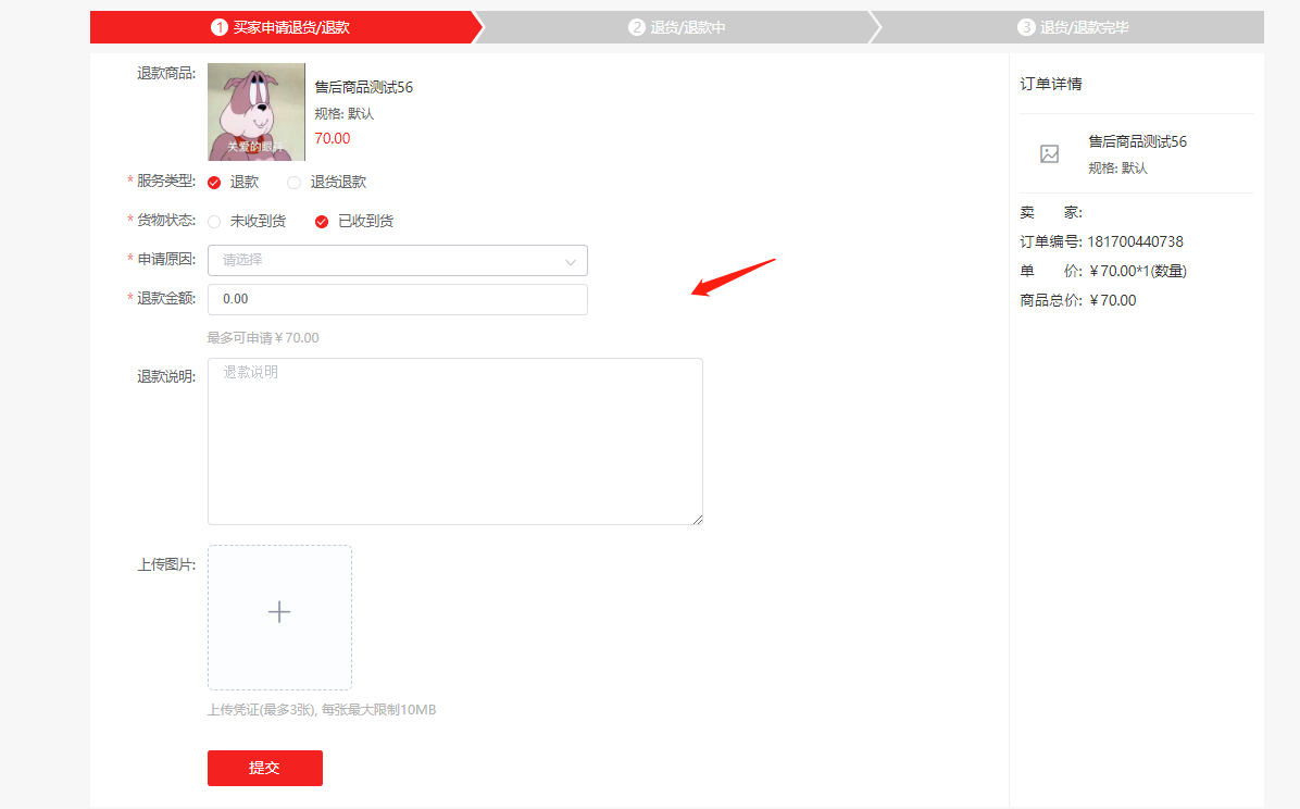 2.可以申请退款/退货退款,选择退款原因,填写退款金额,可以添加退款说明和图片;