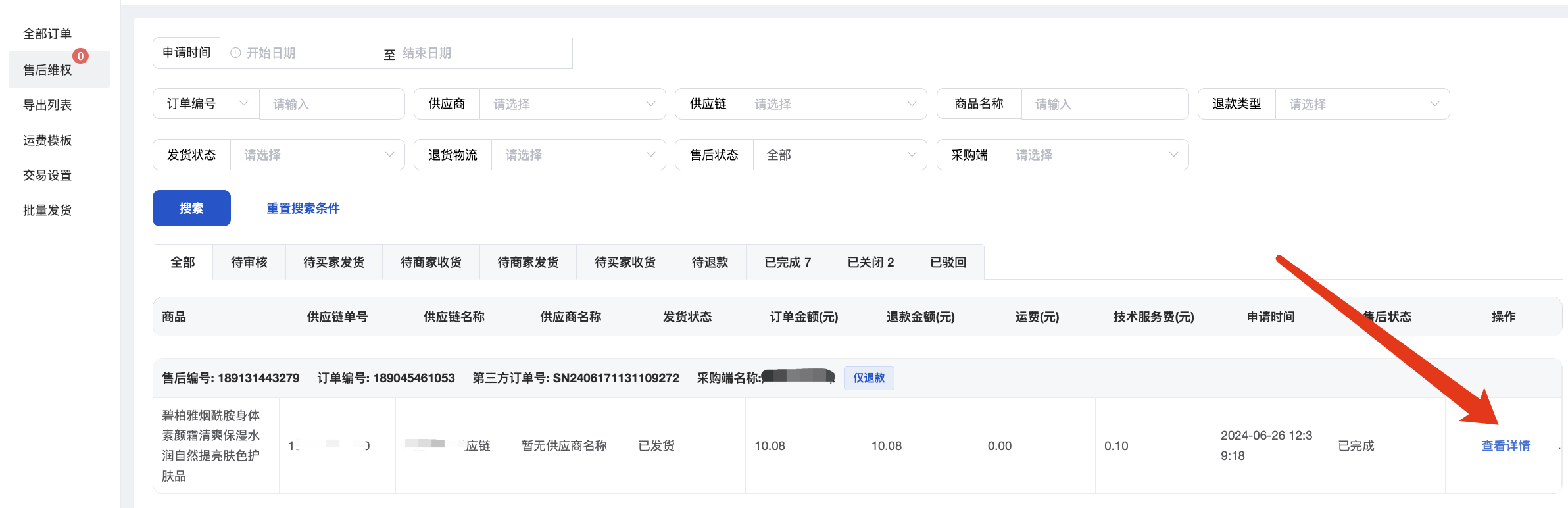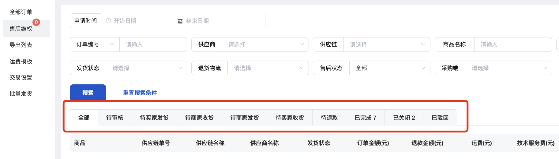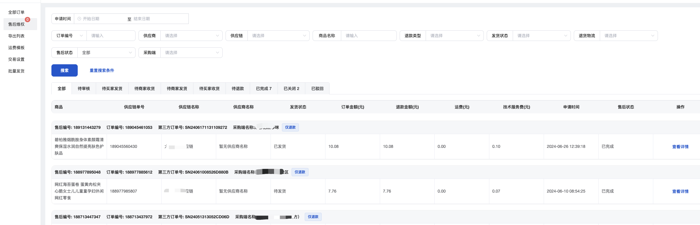 1.进入可查看中台全部售后订单,可按订单编号/供应商/供应链/商品名称/退款类型/发货状态/退货状态/售后状态/采购端/申请时间/,搜索查看或导出售后订单;