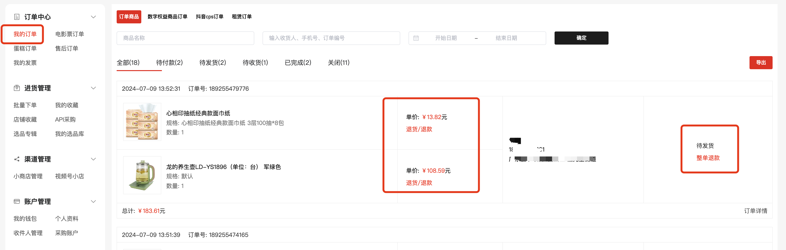 1.用户可在采购端–我的订单,申请退货退款(按商品单个退款),也可整单退款。