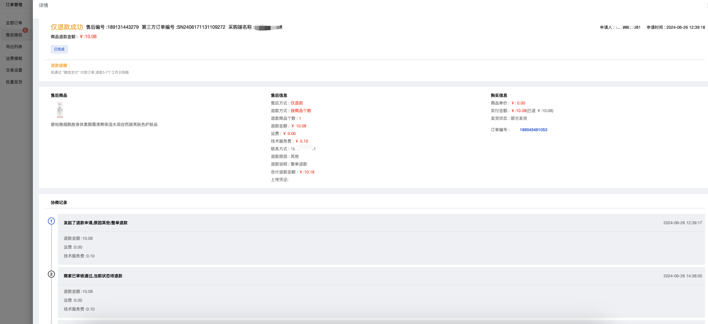 仅退款流程:用户申请仅退款–中台审核通过申请–中台操作退款;