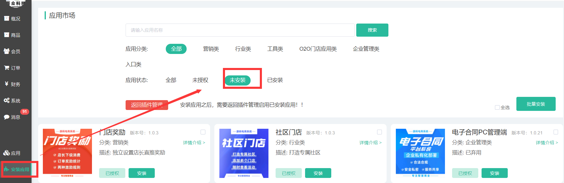 4、插件购买后注意商城更新为最新版本,更新缓存重启队列,在商城后台-安装应用(注意插件市场必须启用,否则会提示不存在页面)-未安装里面安装使用