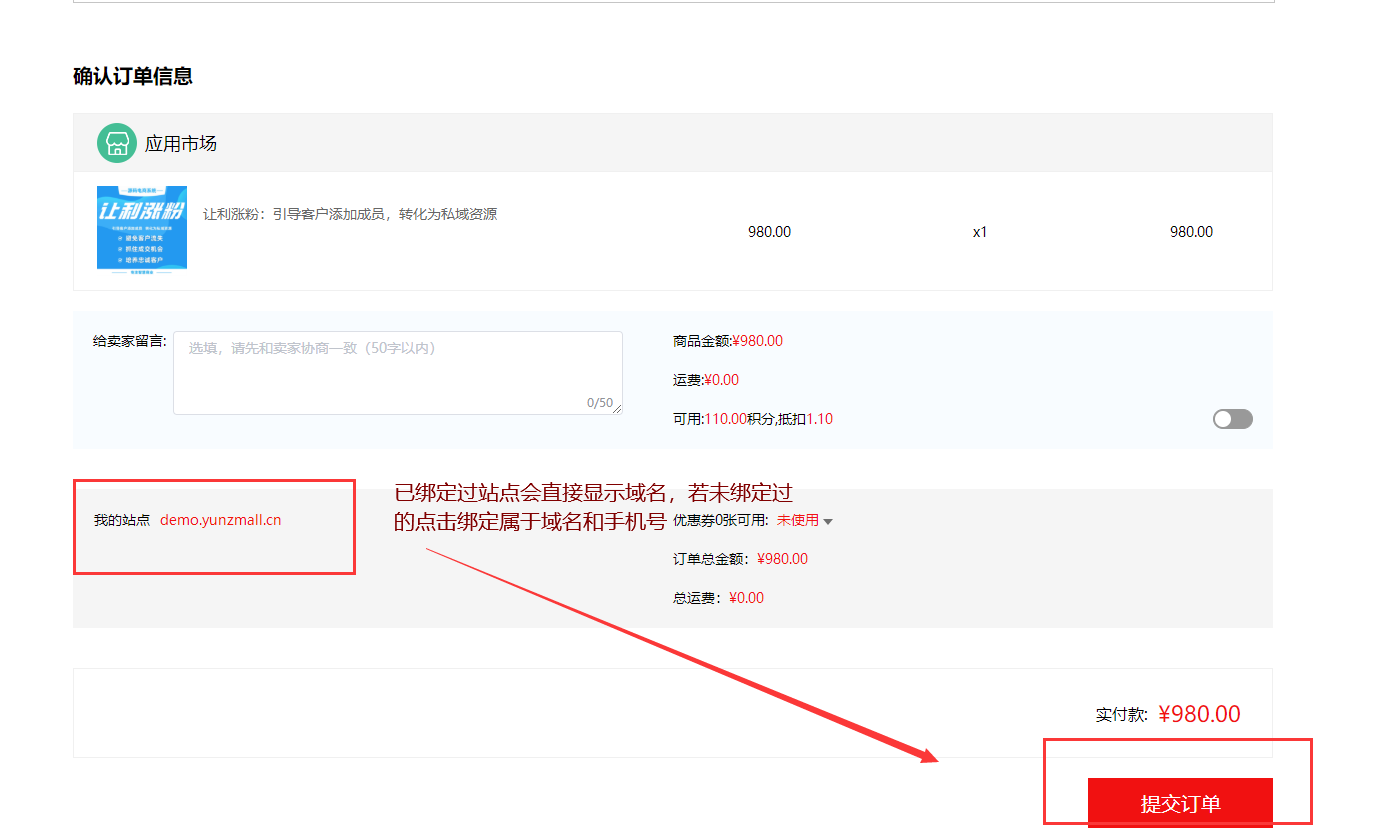 2、或pc端登录https://www.yunzmall.com;搜索需要购买的插件,首次登录需绑定站点,如已绑定过不需要再次绑定;