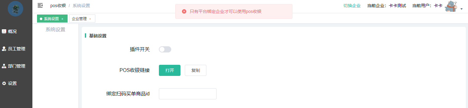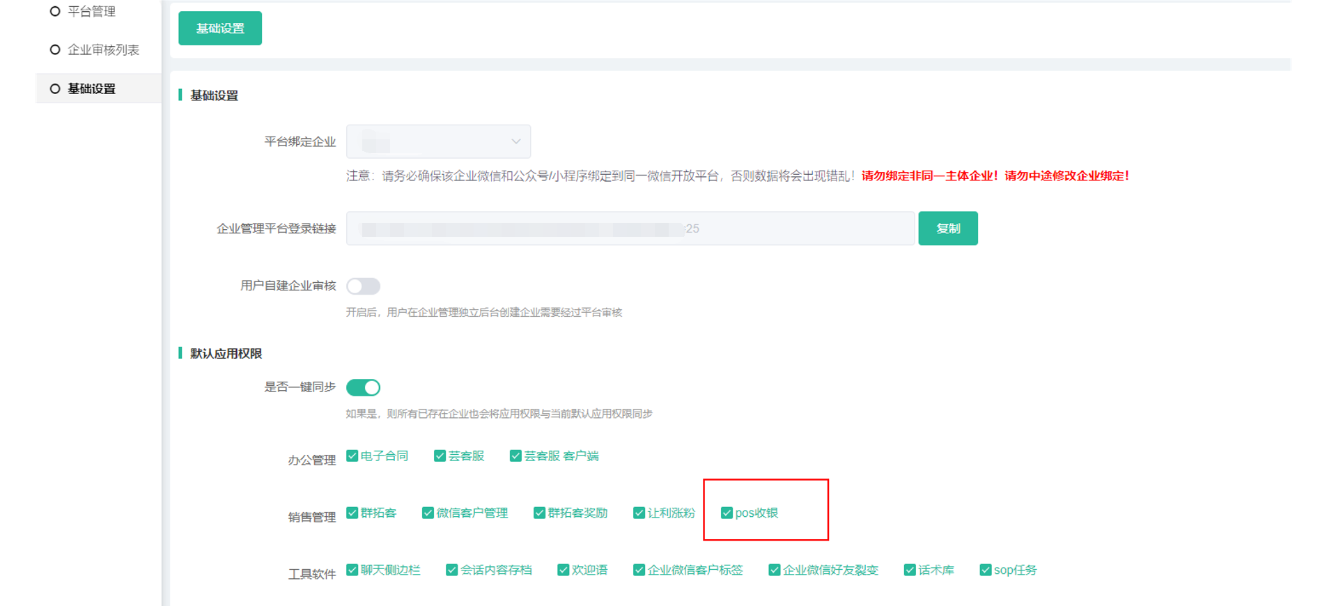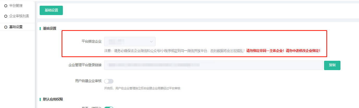 绑定企业查看路径:在总后台–应用,企业管理平台–基础设置绑定的企业才可以使用
