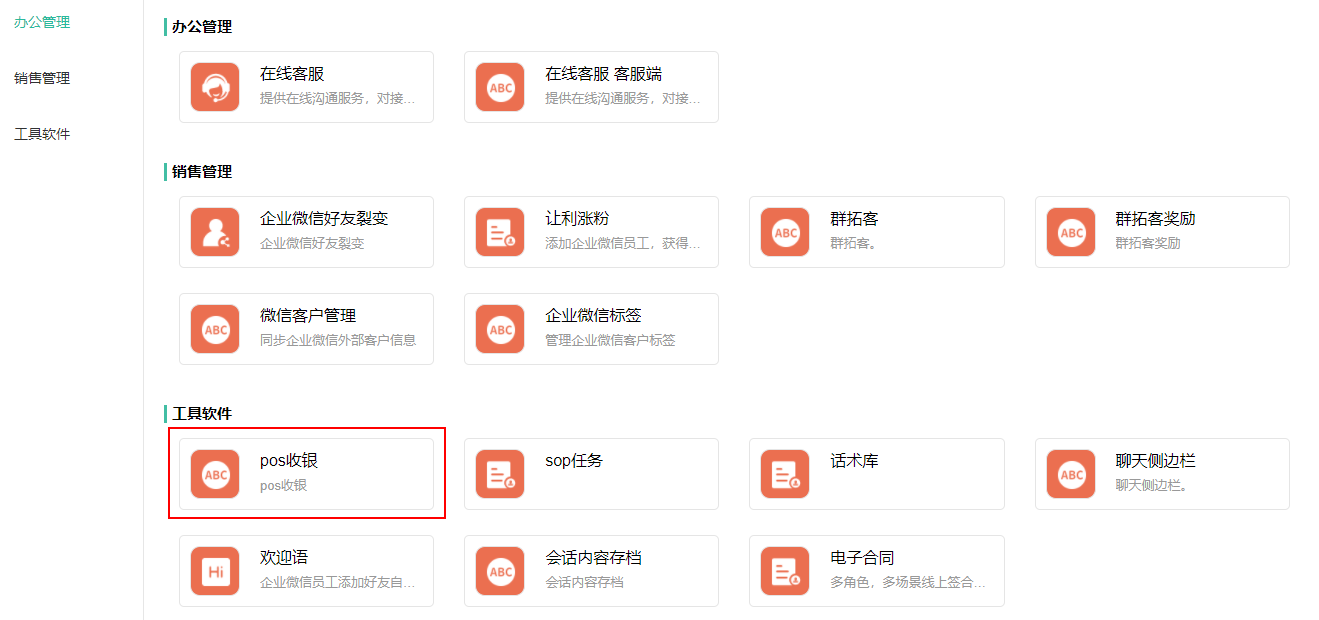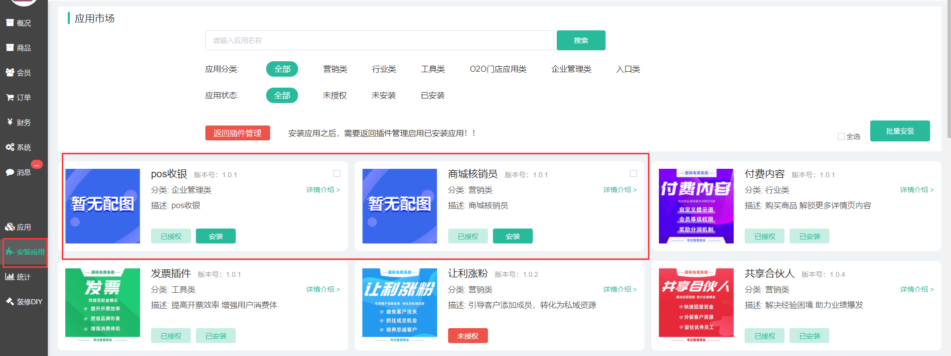安装路径:总后台 — 安装应用 — 搜索“商城核销员+pos收银”并安装