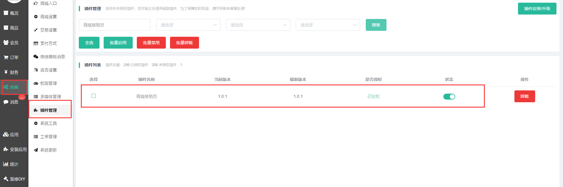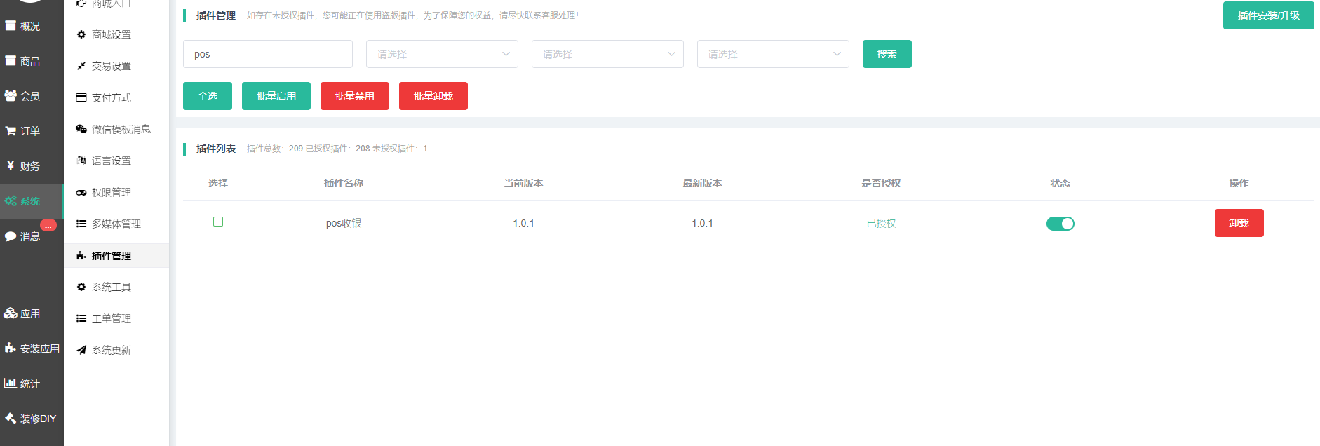启用路径:总后台 — 系统 — 插件管理 –启用“商城核销员+pos收银”插件