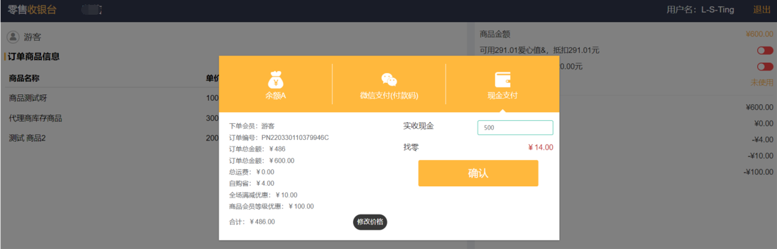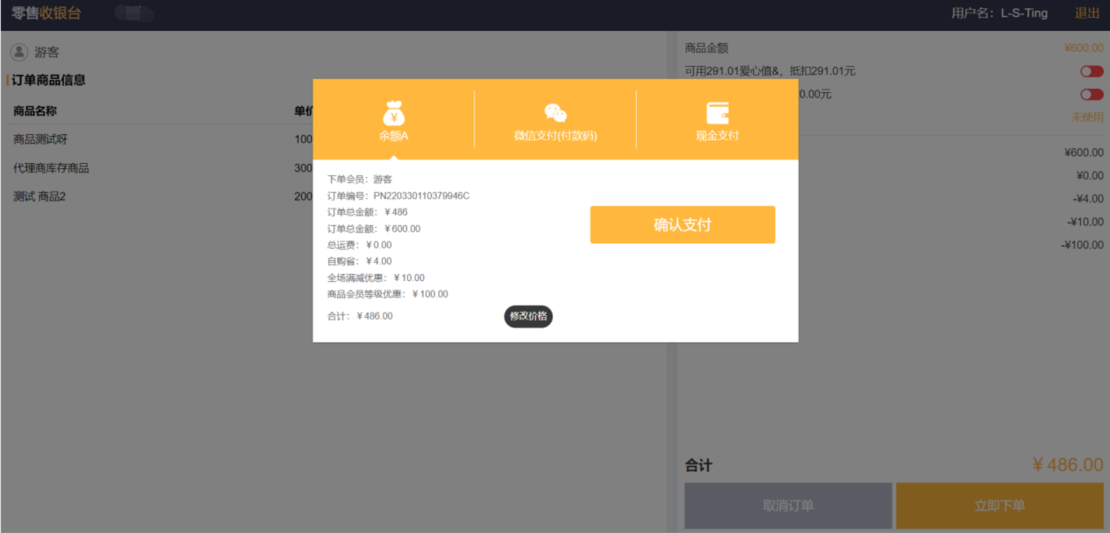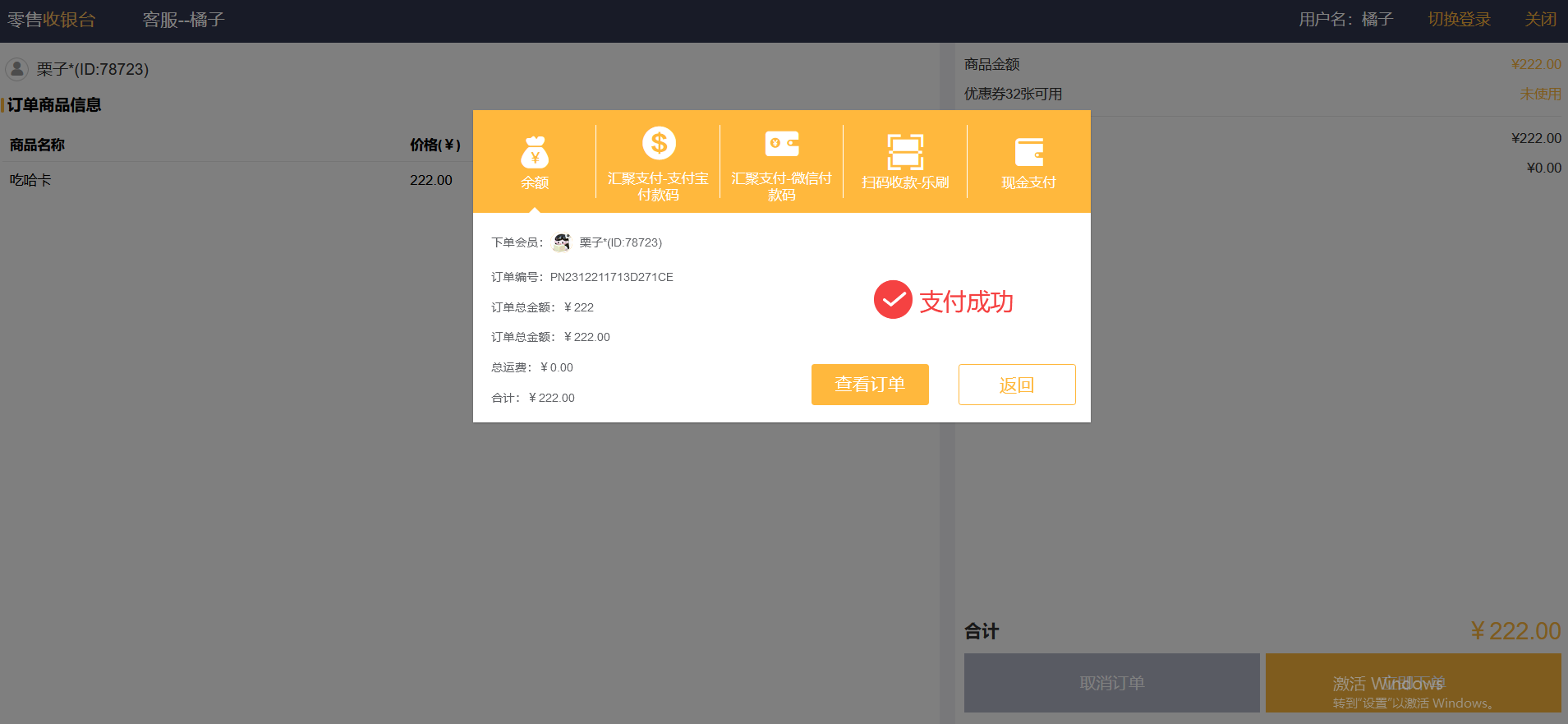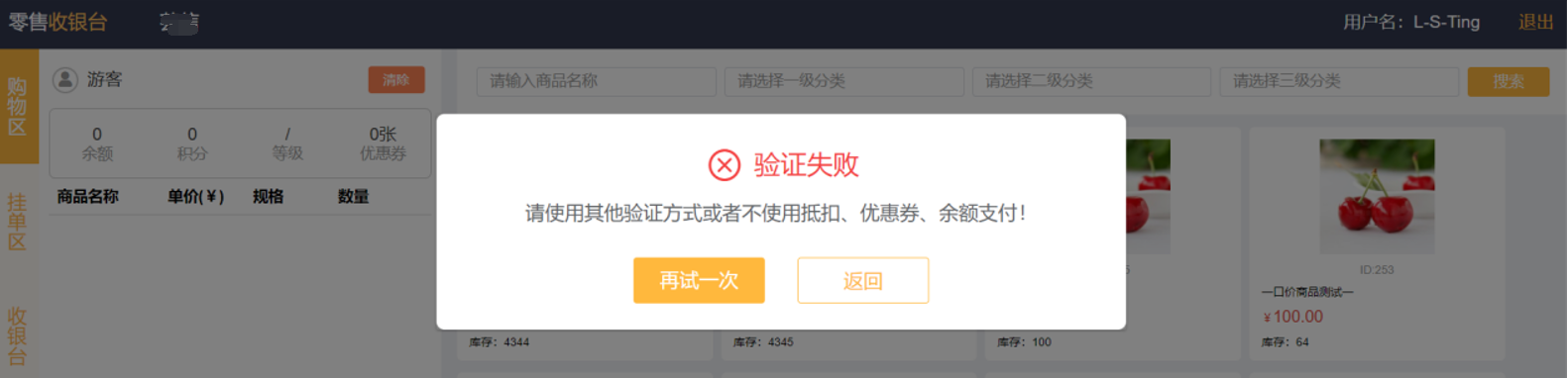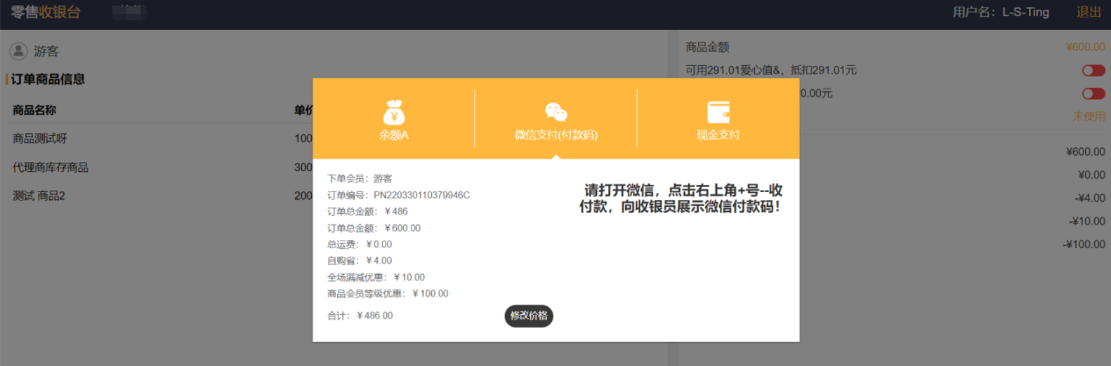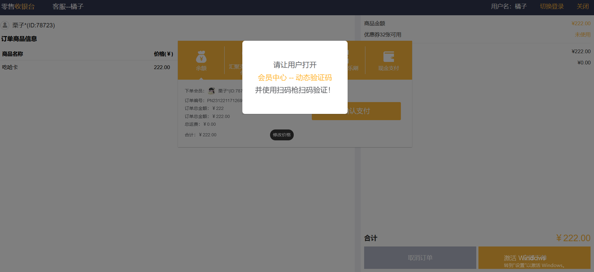 开启 使用余额支付会提示请让用户打开会员中心 — 动态验证码,并使用扫码枪扫码验证!