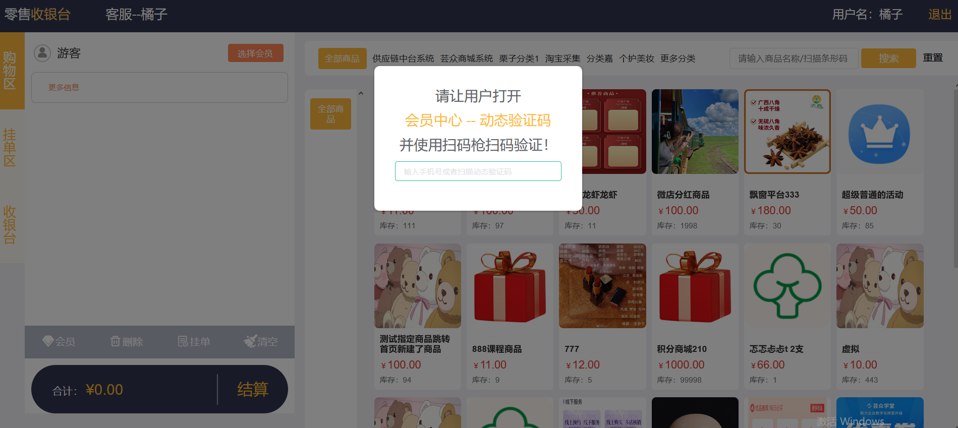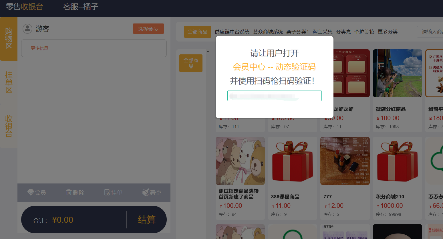 4、会员登录,需要用扫码枪扫描会员中心—动态验证码,才能验证成功;验证成功后,下单将使用验证会员的积分抵扣、消费积分抵扣、优惠券、余额等。