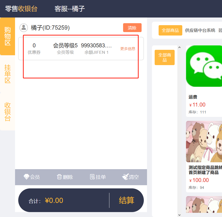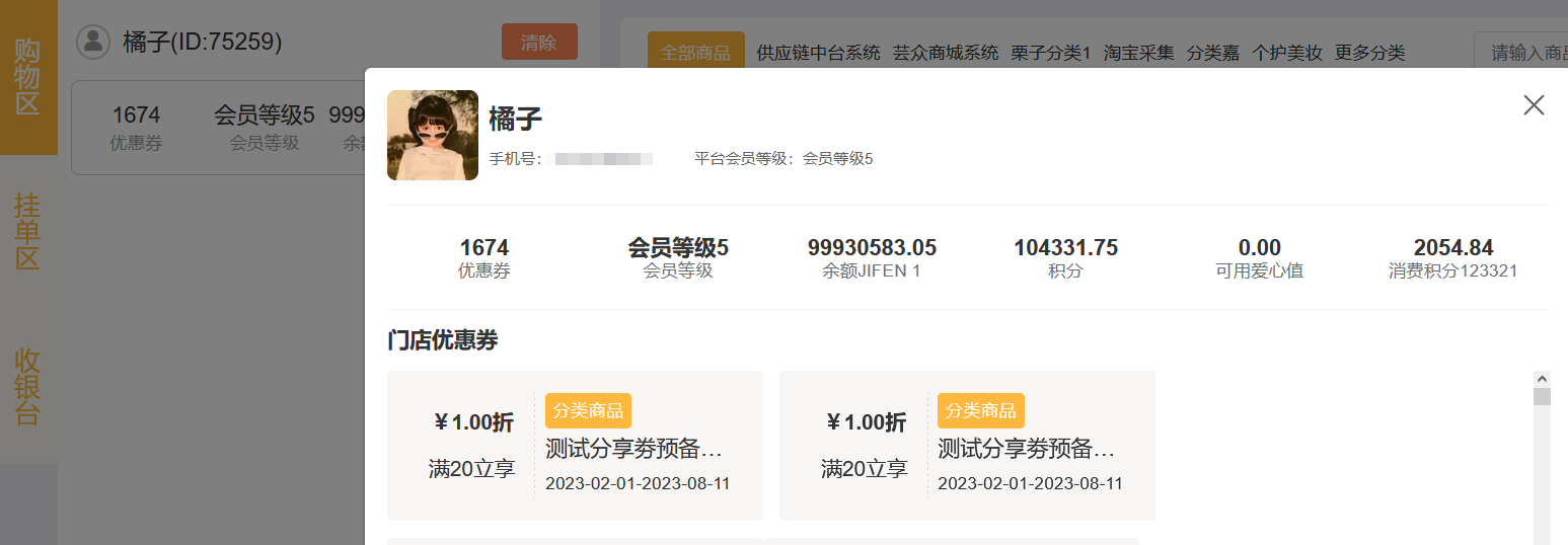 在pos收银页面则会直接显示对应会员的数据,点击更多可用查看其他的信息