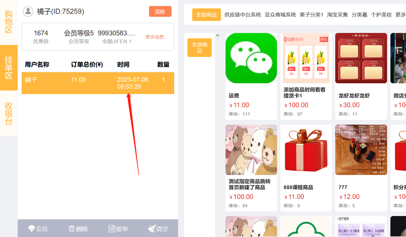 5、挂单区,购物区的商品订击挂单,订单将放置到挂单区;挂单区订单可再次提单到购物区,扫码枪可以扫商品条码添加商品到挂单区(前提商品–编辑–基础信息有添加上商品条码,扫码枪可以直接扫商品条码添加上)