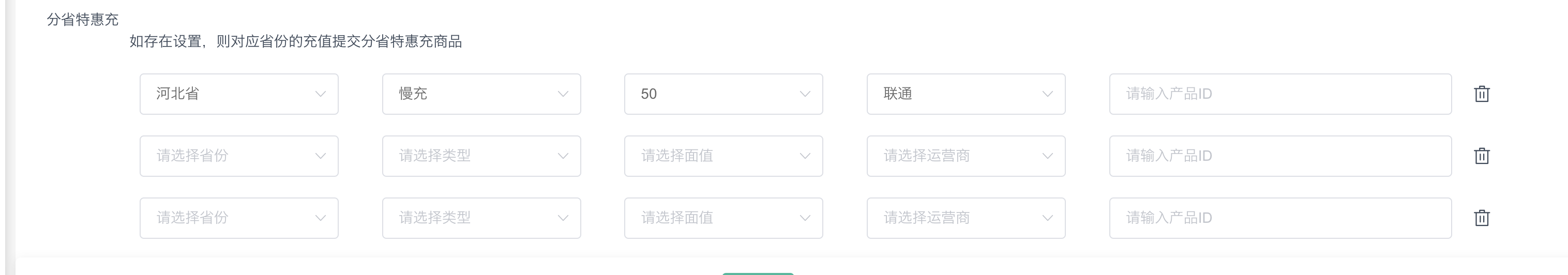 可添加多个分省特惠产品,如第三方平台有话费分省特惠,可使用该功能。