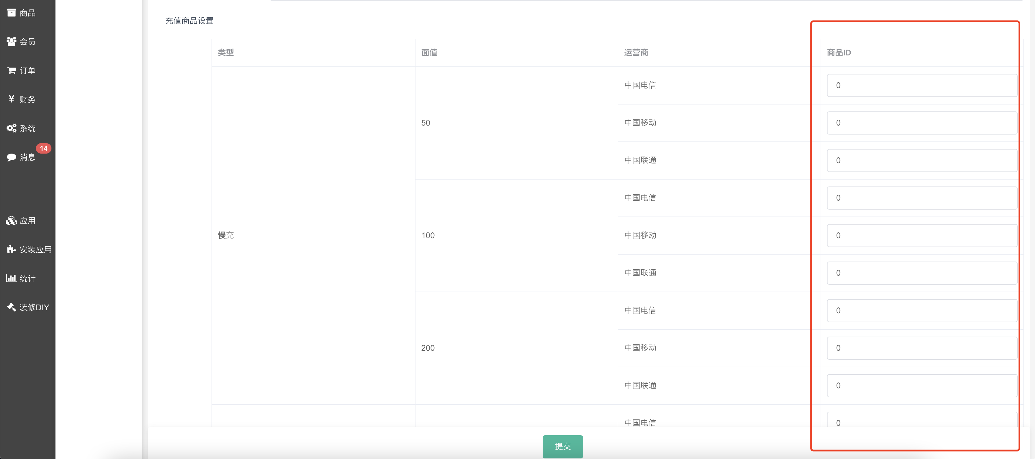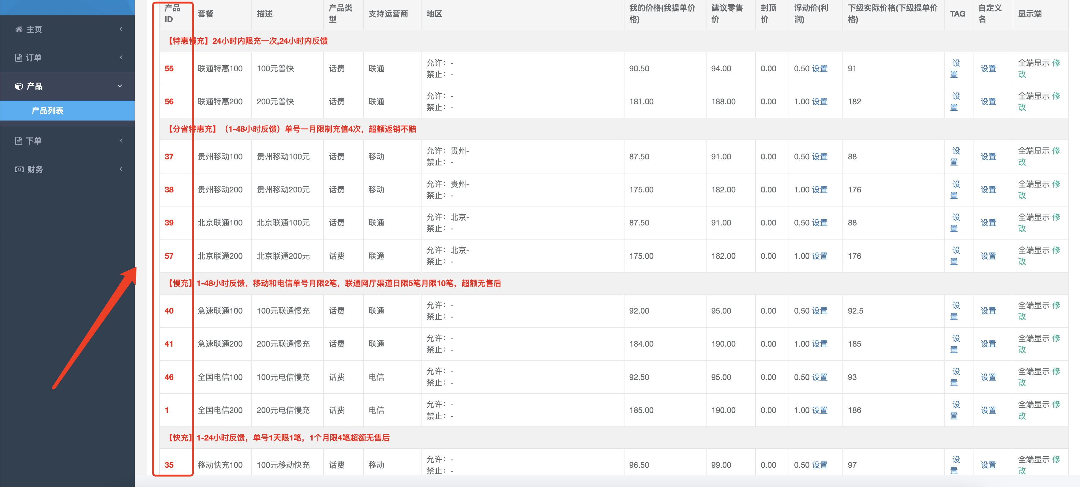 务必注意准确填入对应产品的ID 注意运营商、面值!!