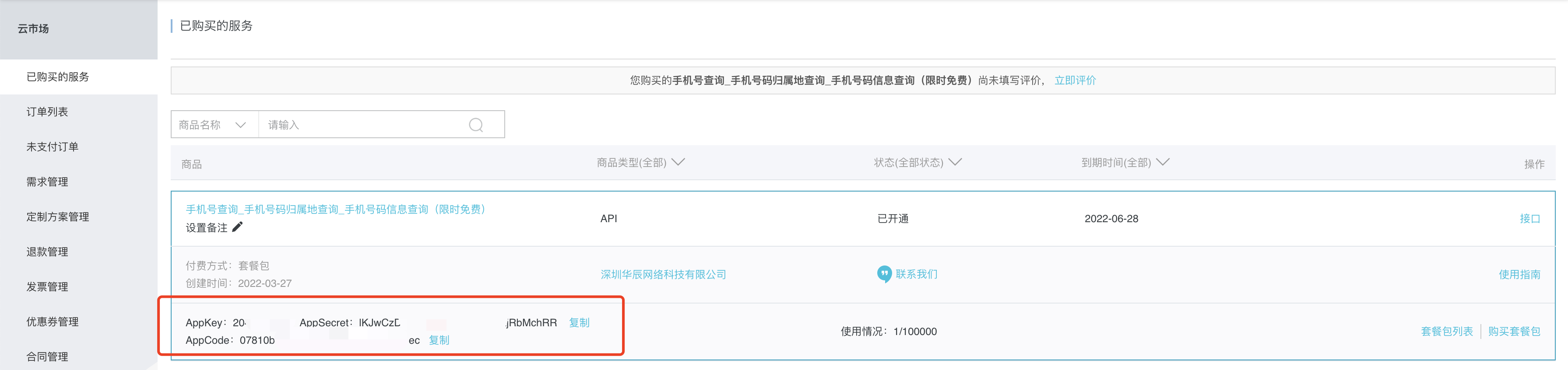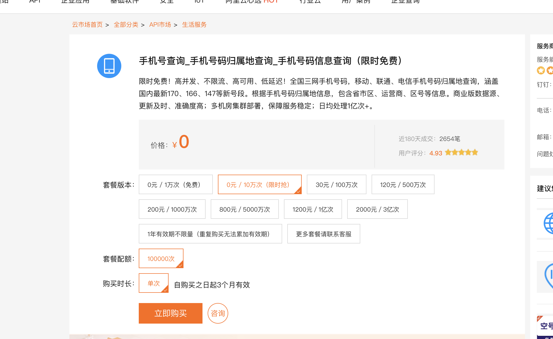 通过阿里云服务市场购买手机号查询接口,有10万次免费权限,购买后填入上方设置中。