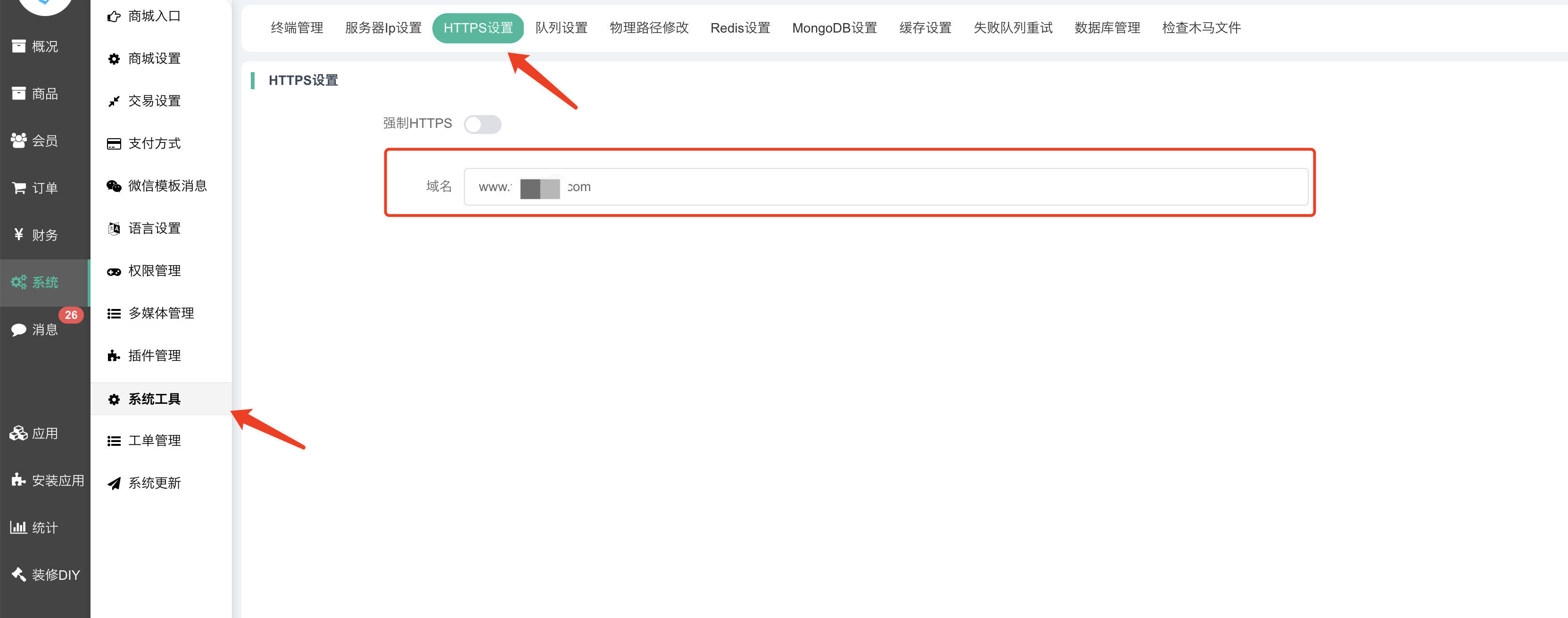 使用前,请确保您已经正确设置了域名信息;系统–系统工具–https设置,域名,如下图: