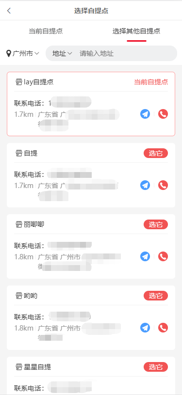 【注:此页面显示全部的自提点、城市只是筛选,显示顺序为当前自提点—城市—距离】