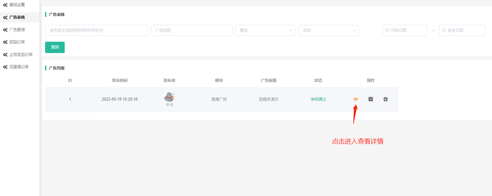 1) 操作—查看详情:可查看广告详情