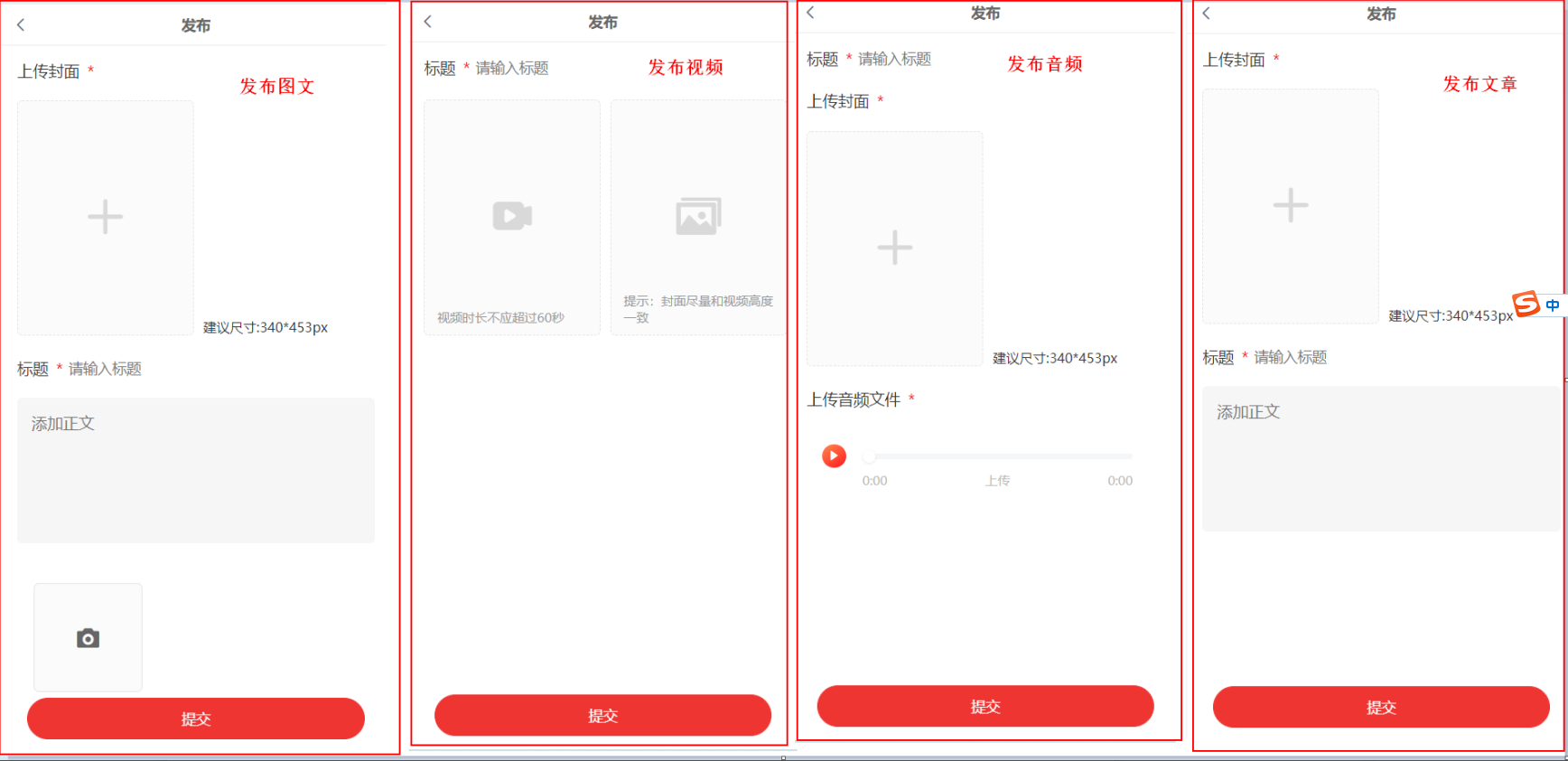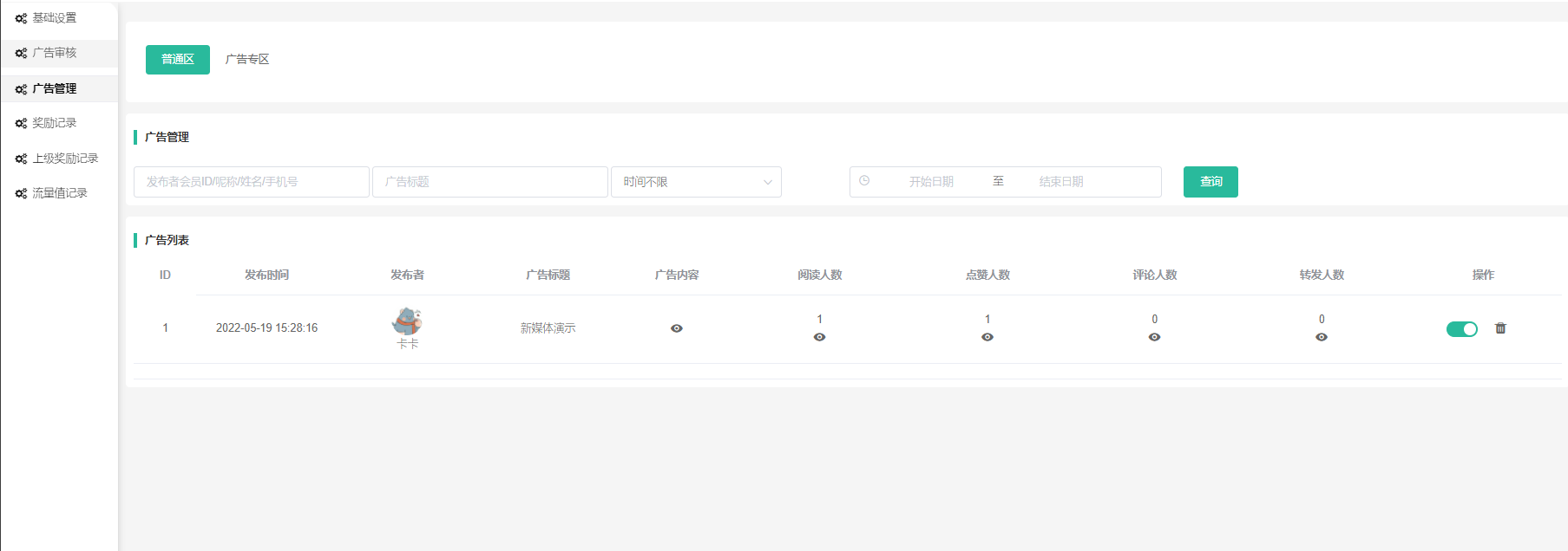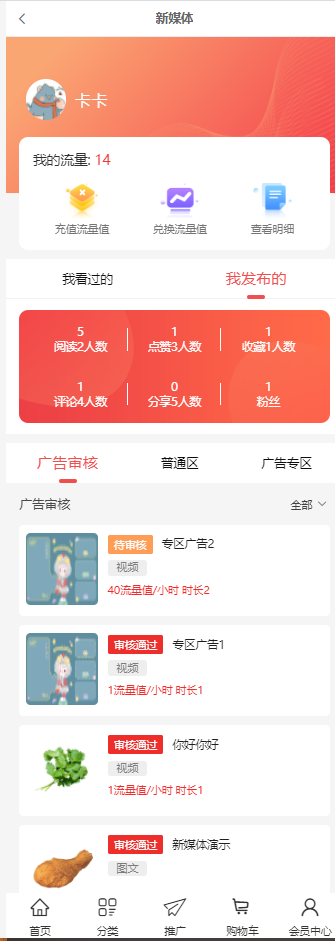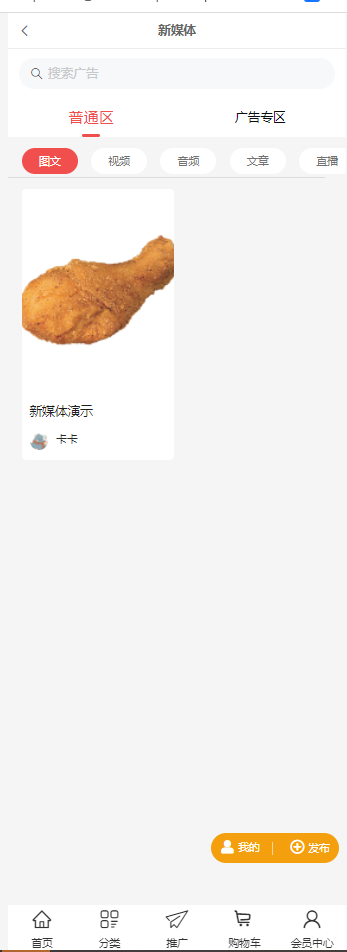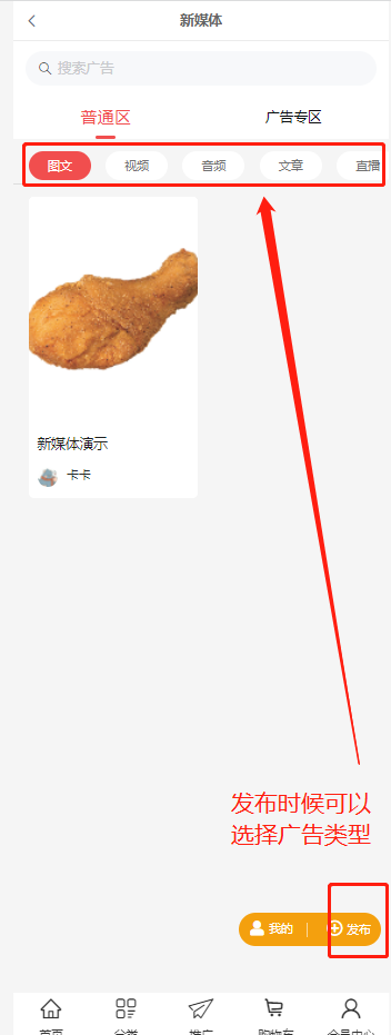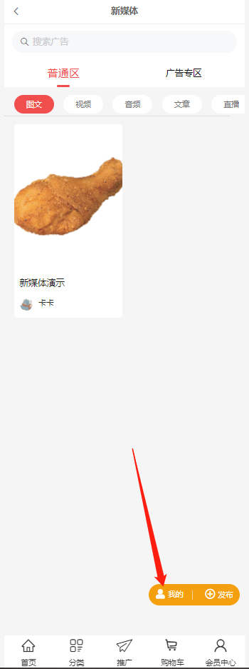 1、插件分为2个模块:普通区(图文、视频、音频、文章)和广告专区(视频)。在普通区发布内容没有条件,广告专区是流量值达到X的会员可发布。