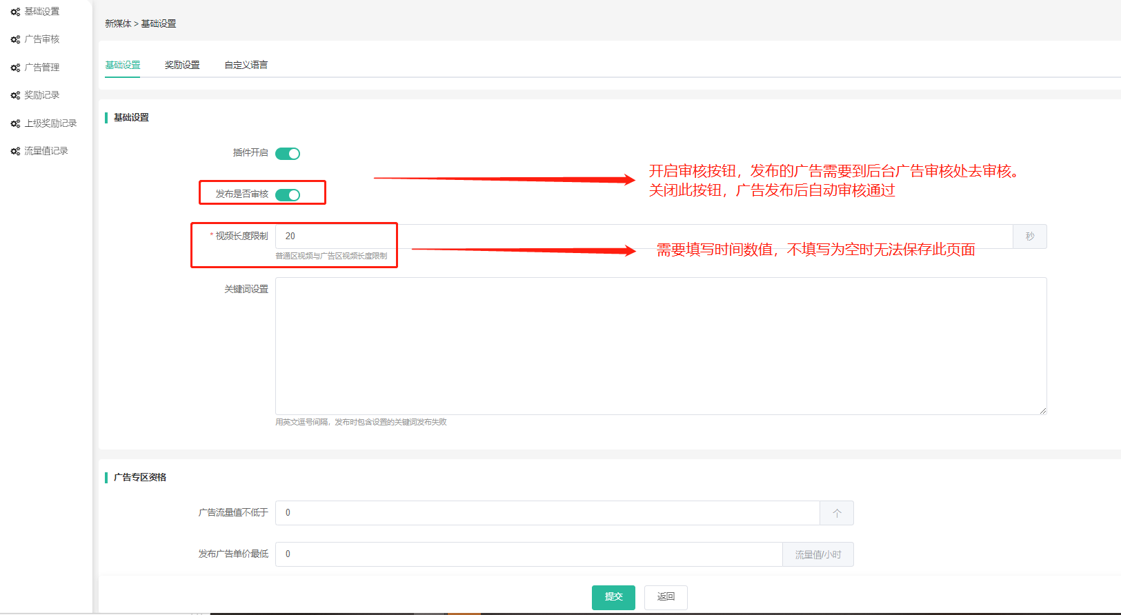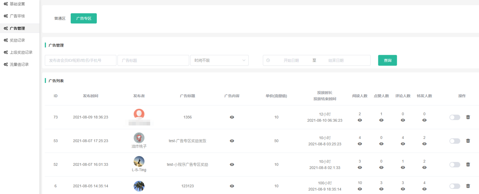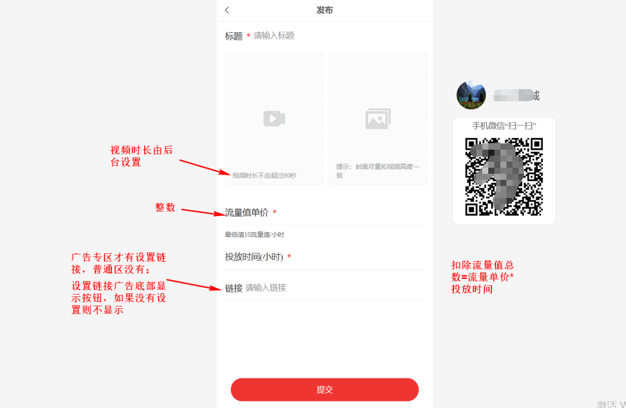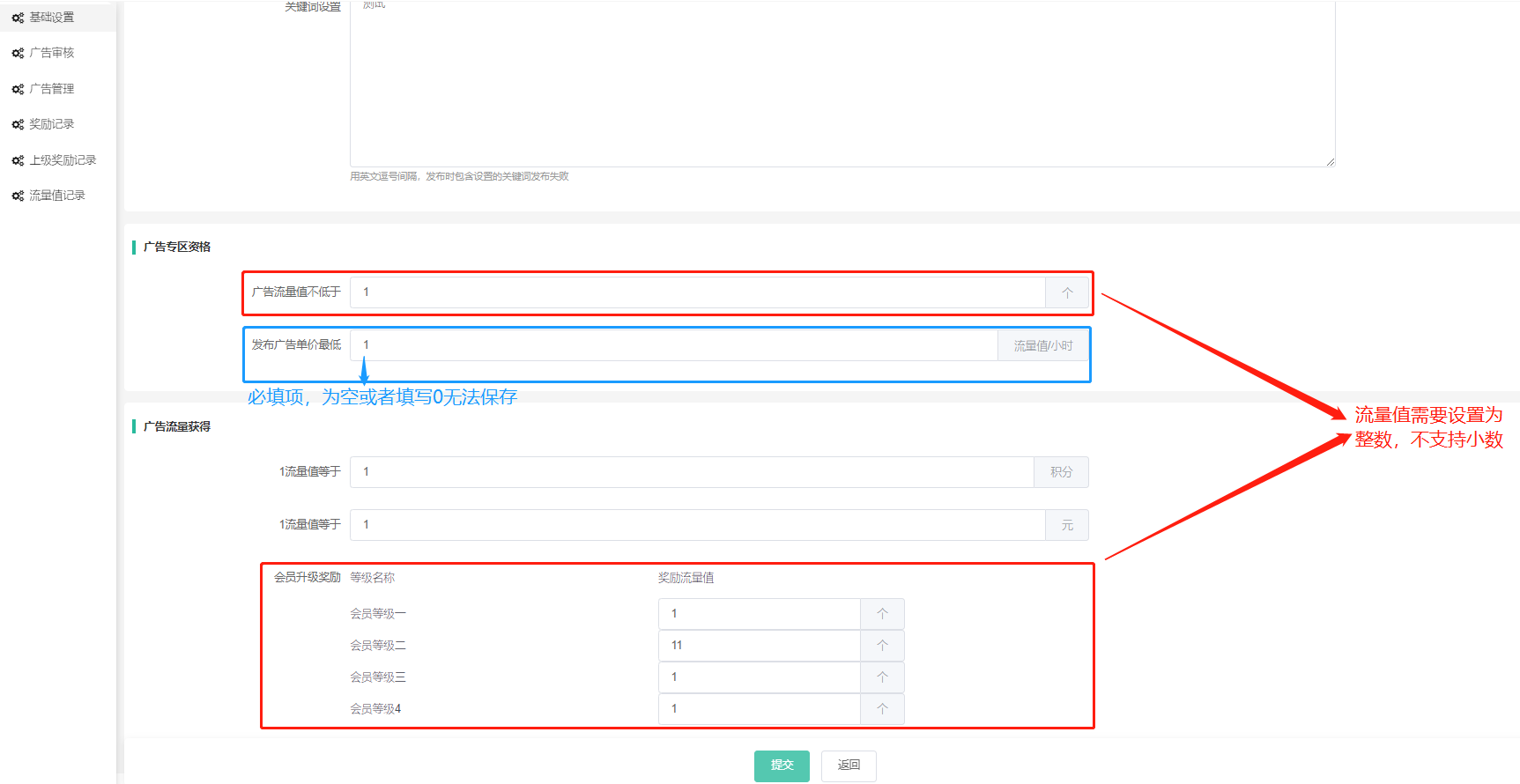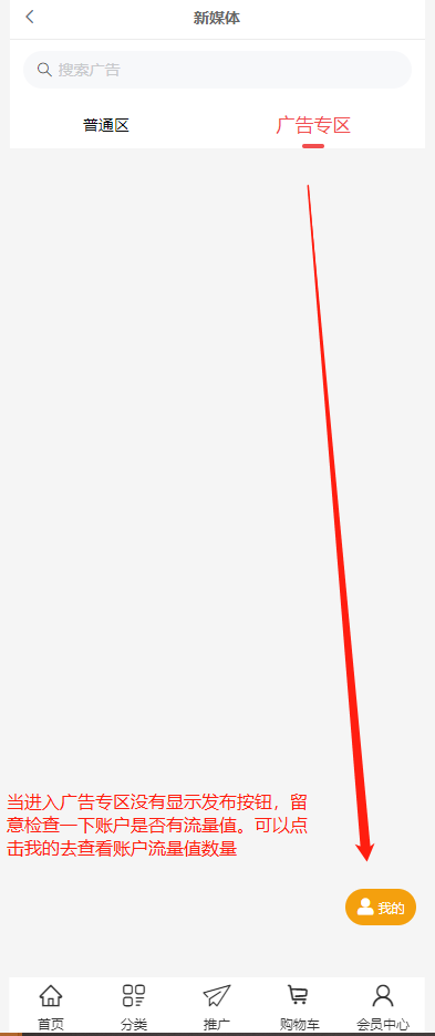 发布广告单价最低:广告专区发布的广告单价设置流量值不能低于后台设置的值