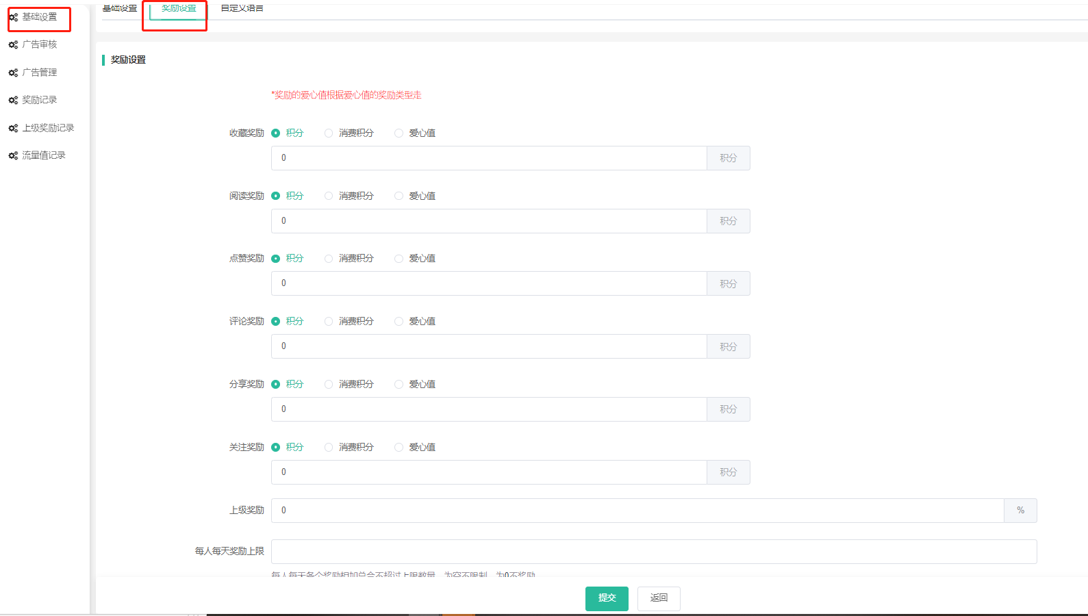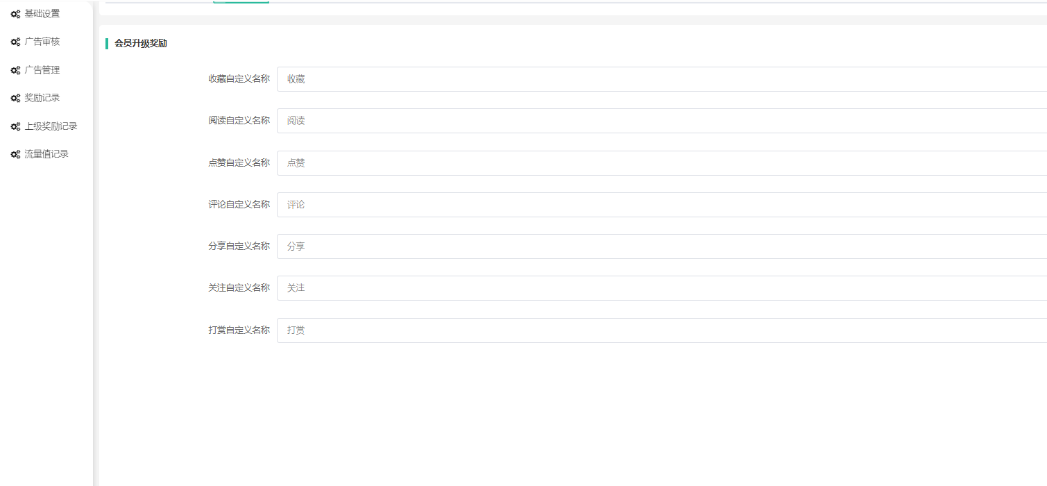 3、普通区和广告区的内容都可进行阅读、点赞、评论、打赏、关注、收藏以及分享等动作且获得相应奖励。(动作名称可自定义,可参数化设置奖励额度,广告区和普通区奖励是统一设置的)。