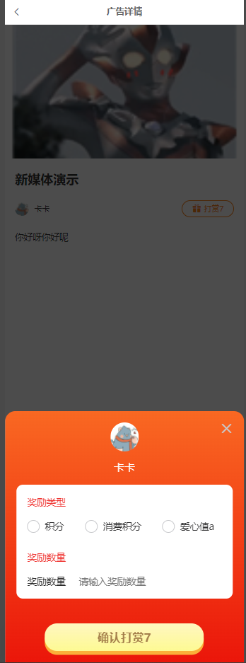 3) 打赏。打赏成功后可以查看对应的明细记录,消费积分和爱心值可以后台自定义名称