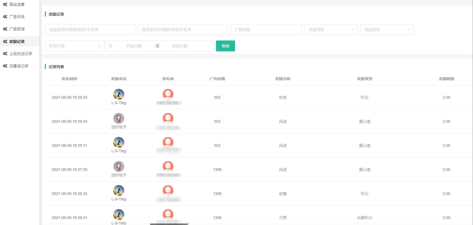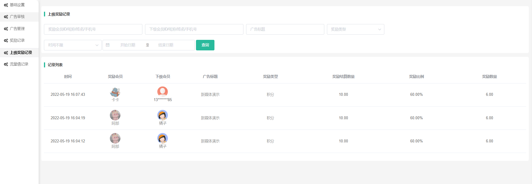 5、上级奖励记录