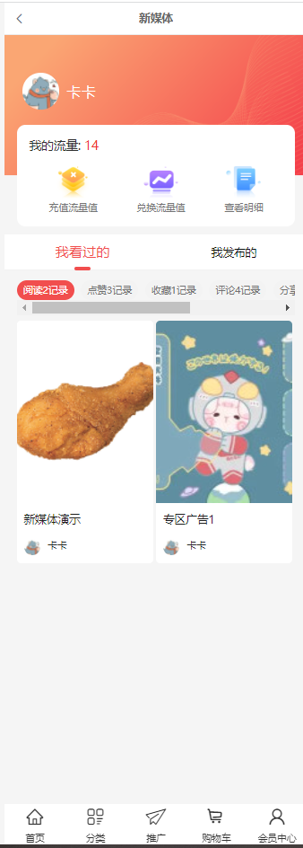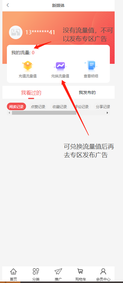 2、流量值获得渠道有积分兑换/直接购买/升级等级。会员发布广告扣除流量值,设置投广单价多少个流量值/小时,广告专区按单价高到低进行排序,单价一样高的按广告主的流量值进行排序,流量值一样高的按阅读量进行排序。