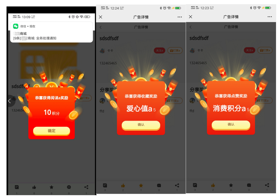 会员首次收藏、阅读、点击、分享、评论按照对应的奖励发放,每个广告奖励一次,对应的奖励有明细记录;