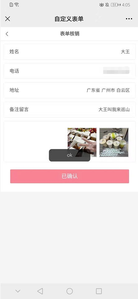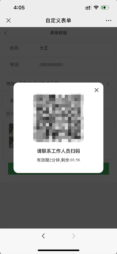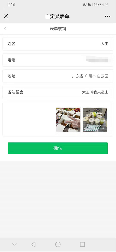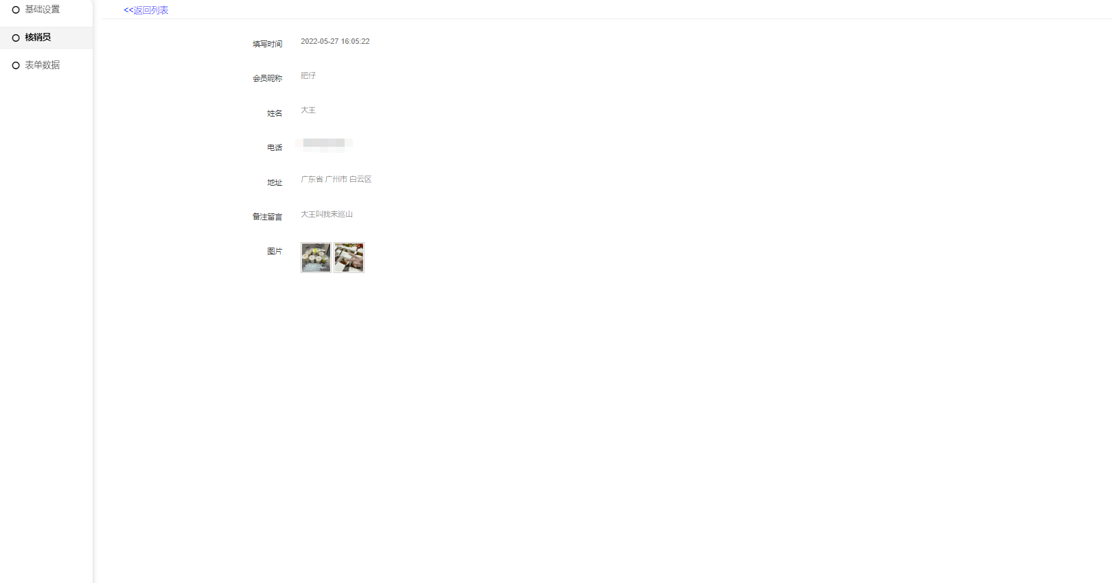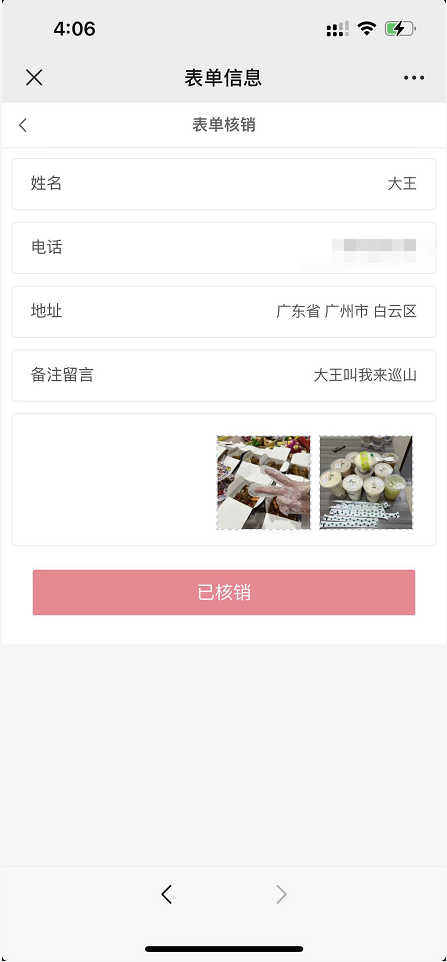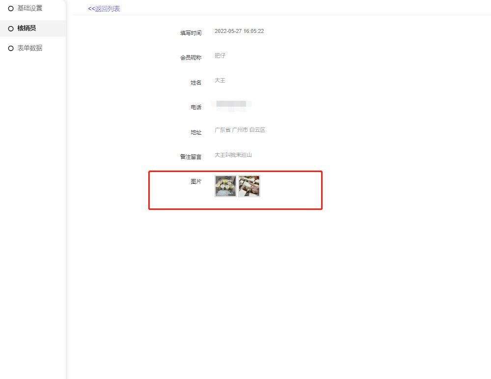 查看详情,可查看核销员的核销记录、核销表单内容。若表单数据有图片信息,点击可放大浏览,如下图所示。