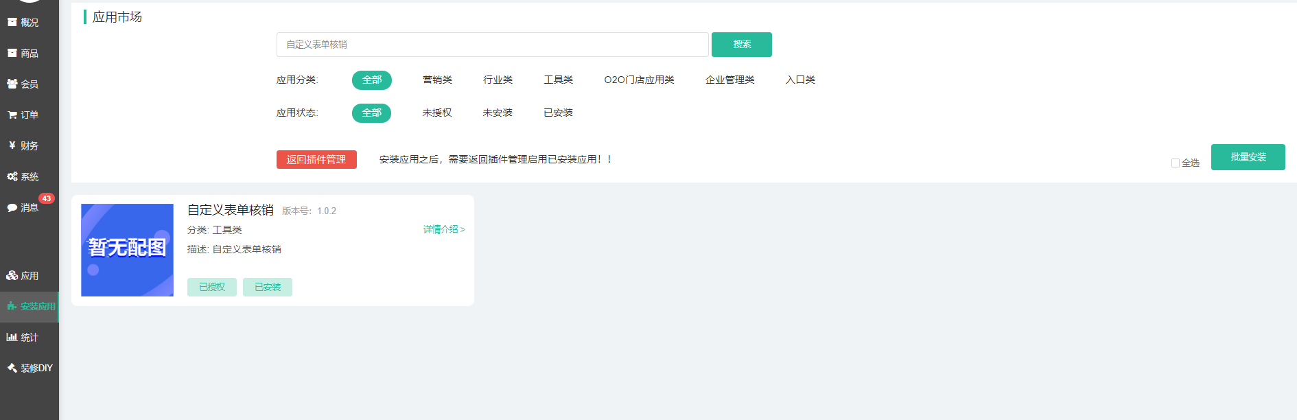 安装路径:总后台 — 安装应用 — 搜索“自定义表单核销”并安装