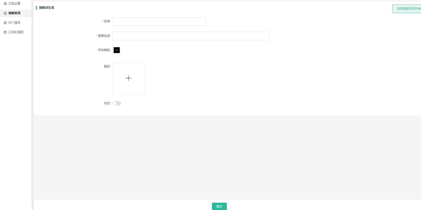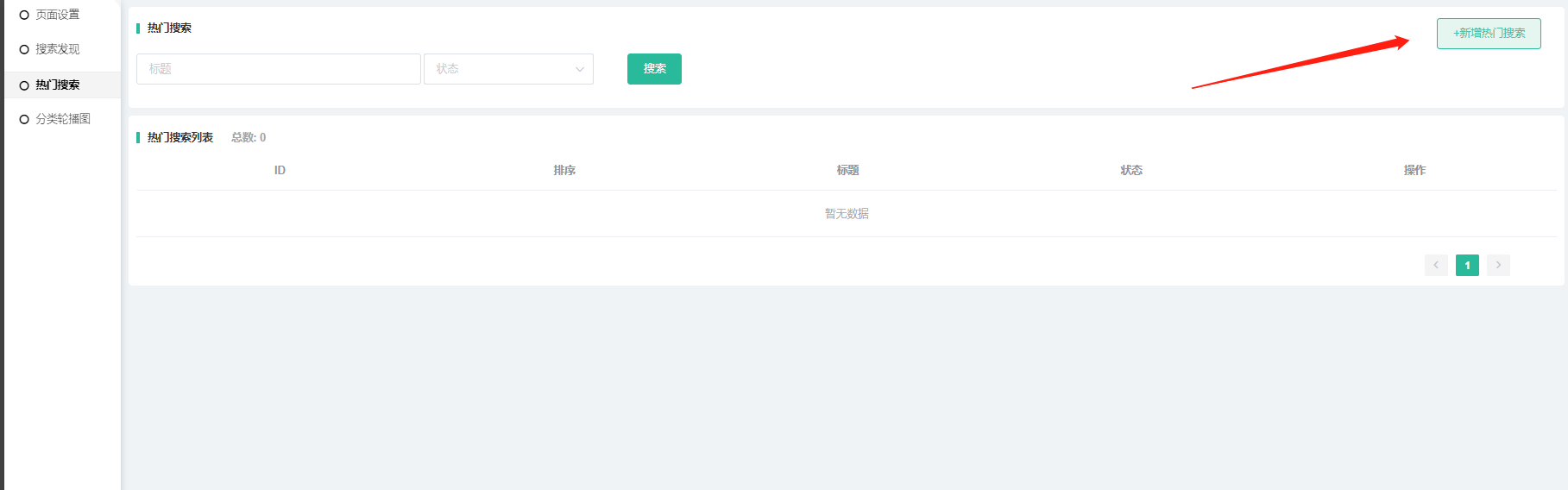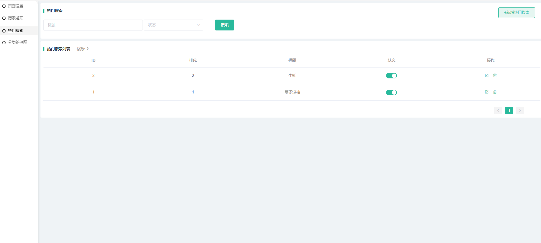 1、添加热门搜索,设置排序(数字大靠前显示;排序数字一样创建ID小靠前显示)、标题、副标题、图标、小程序链接,是否开启。