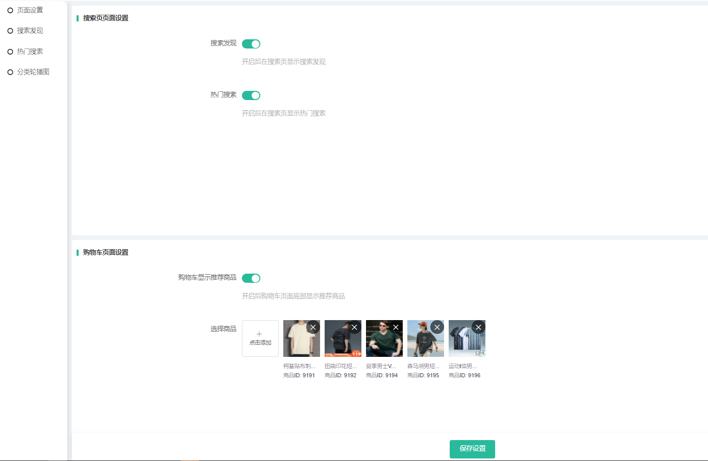 页面设计功能 帮助平台打造人货相遇新触点。搜索页显示搜索发现、热门搜索;分类页显示顶部图片;购物车显示推荐商品。仅支持小程序端。