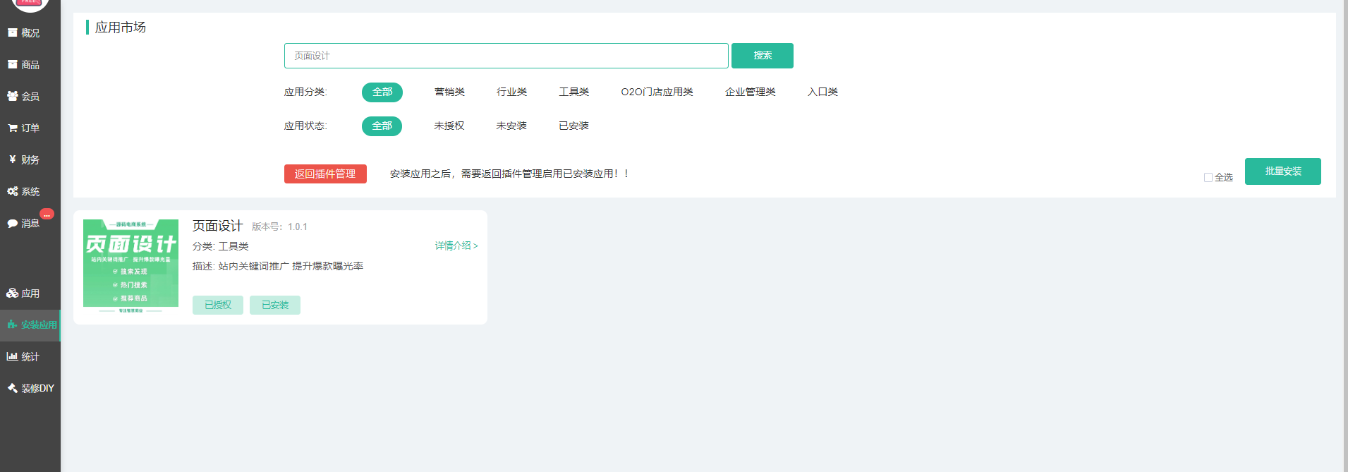 安装路径:总后台 — 安装应用 — 搜索“页面设计”并安装