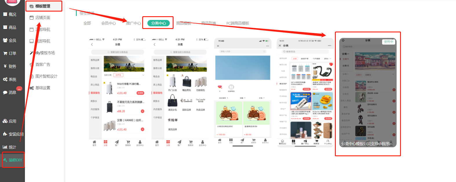 2、装修DIY插件 — 模板管理 — 分类模板 — 选择模板5(分类中心模板5),前端分类模板5的样式显示
