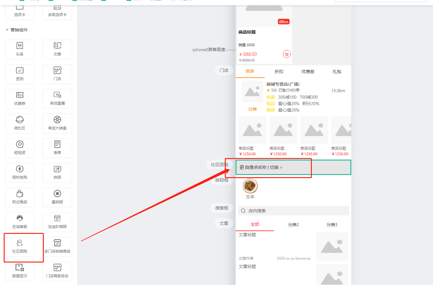 功能逻辑:供应商关联自提点,装修页面选择社区团购组件,会员前端进入选择自提点,选择自提点后进入新分类页面显示平台自营和该自提点关联的供应商的商品,选择商品下单自提点默认显示在首页选择的自提点;选择自提点后分享,其他会员进入默认显示分享的那个自提点