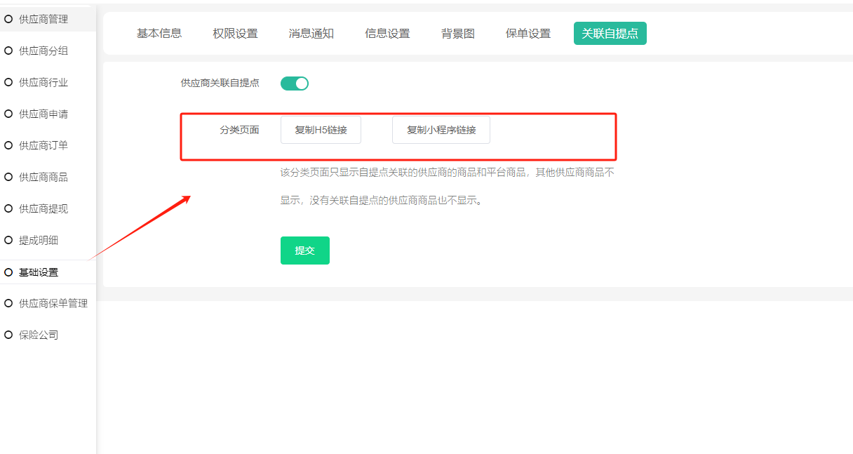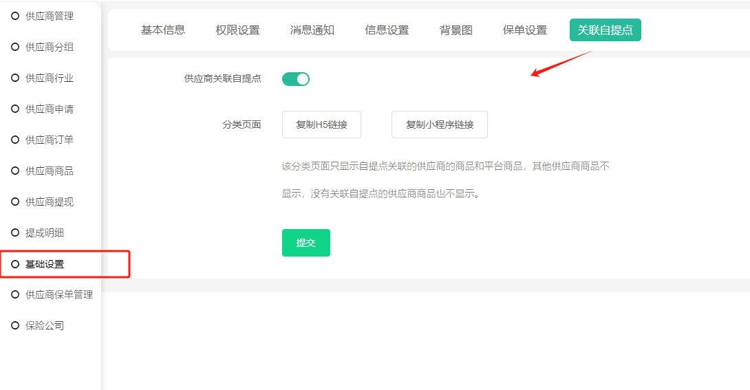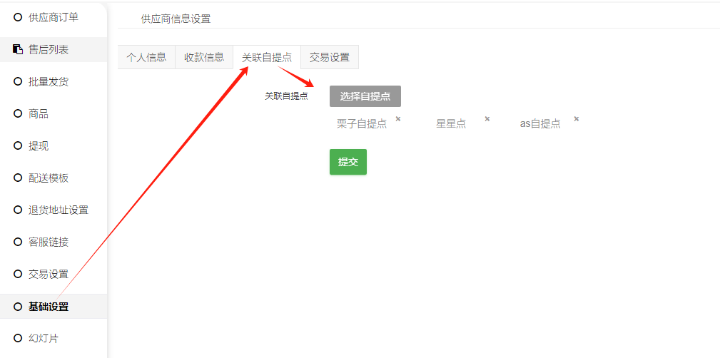 1、供应商插件—基础设置,开启关联自提点功能,开启后供应商商品信息、供应商独立后台—基础信息才会显示关联自提点的选择