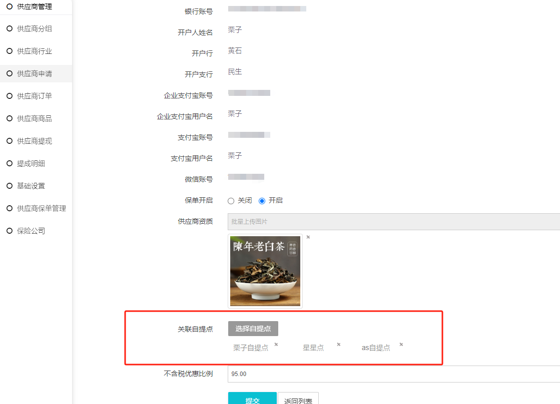供应商信息和供应商独立后台基础设置增加关联自提点:一个自提点只能被一个供应商关联,一个供应商可关联多个自提点