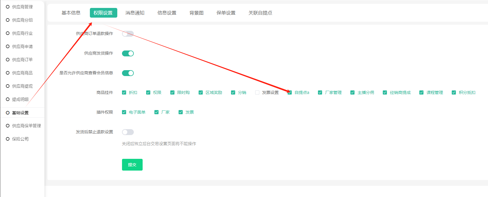 总后台供应商插件–基础设置–权限设置–商品挂件–选择自提点,供应商独立后台发布商品—指定自提点自动选择已关联的自提点