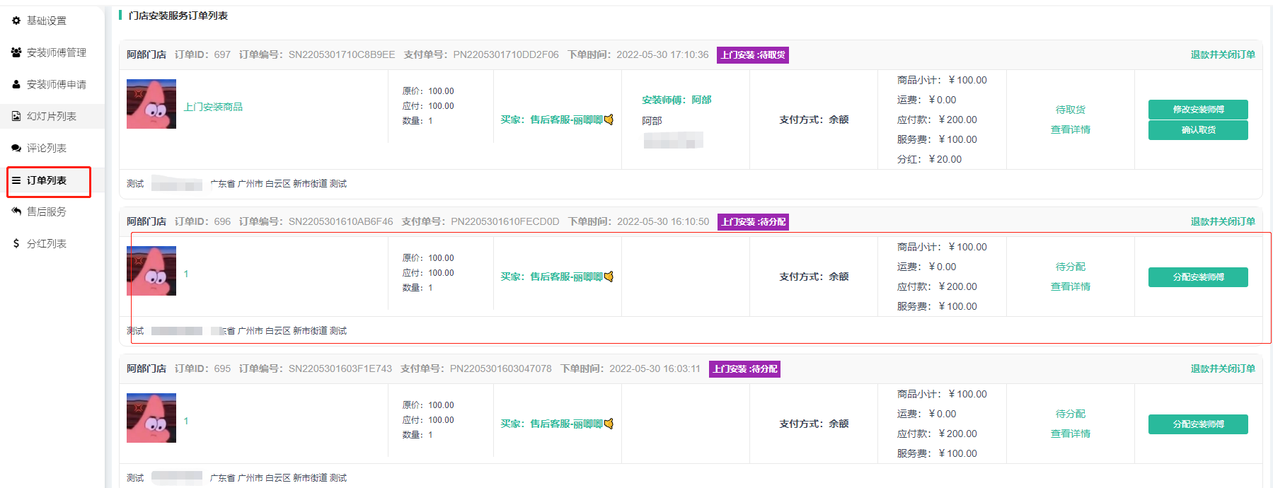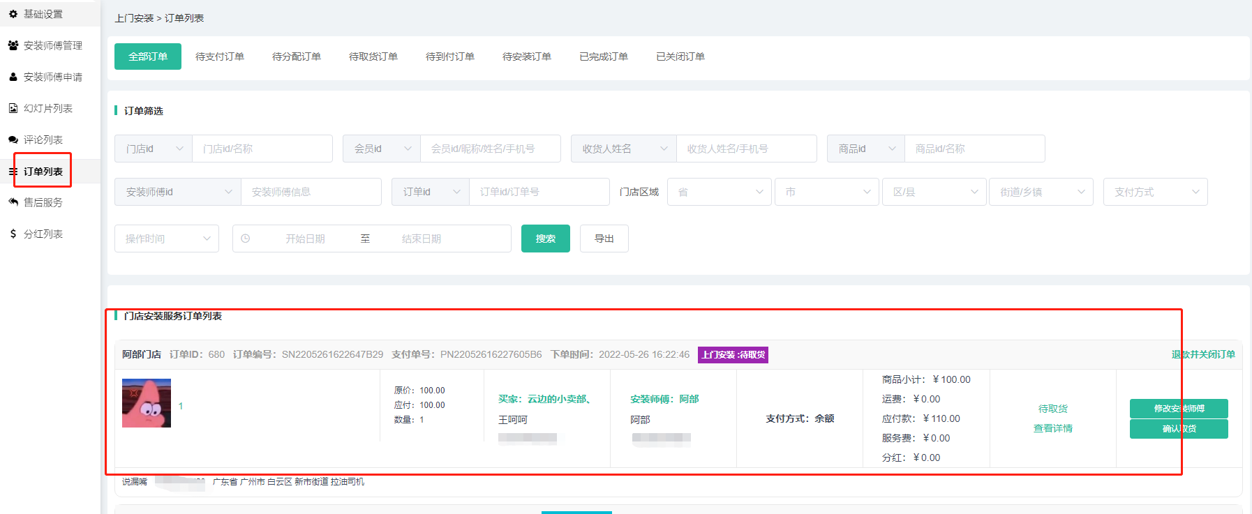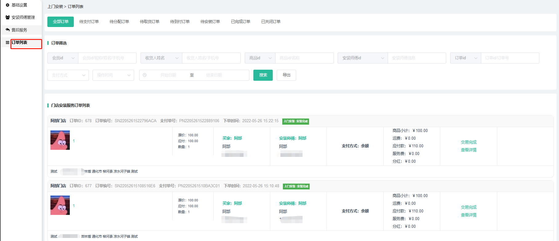 3、 在订单列表页可查看到安装师傅,订单支付状态,商品金额,服务费金额,分红金额,订单状态