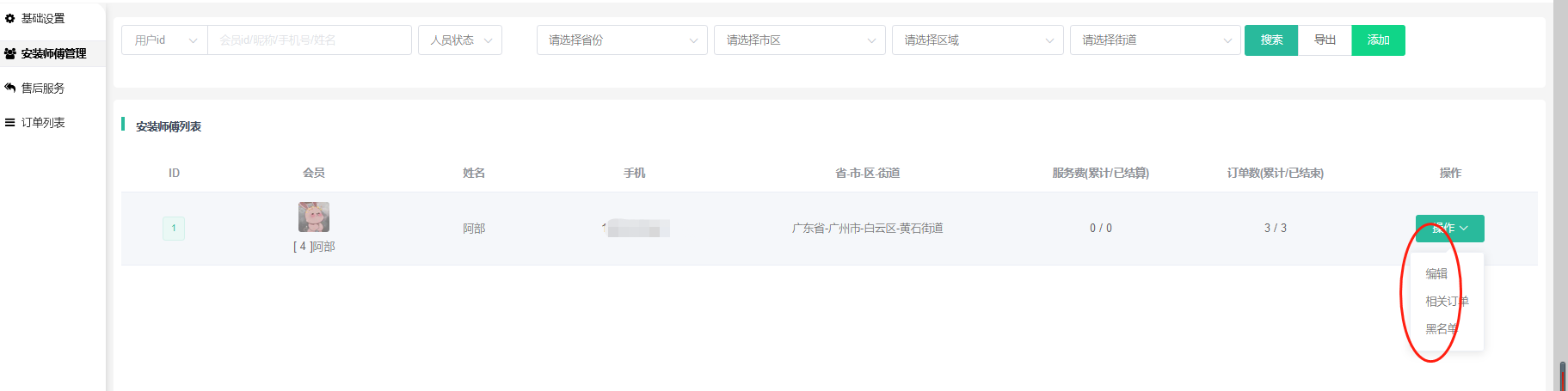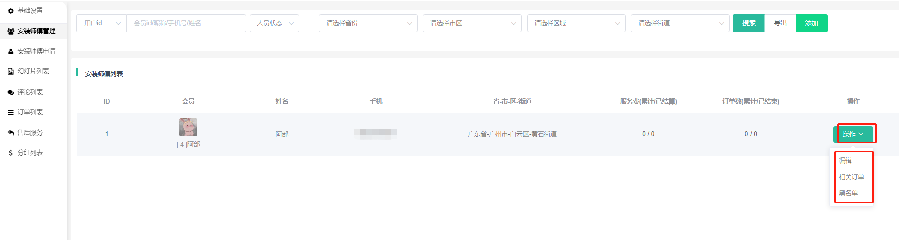 5、点击操作–黑名单可把安装师傅加入到黑名单,加入黑名单的安装师傅不能再进行接单,已接单的可继续完成,收入会正常结算