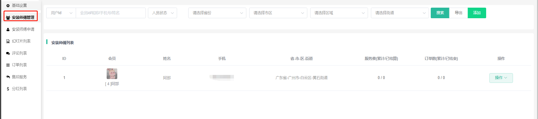 2、 在安装师傅列表可查看到安装师傅会员信息,所在地区,服务费,安装订单数量