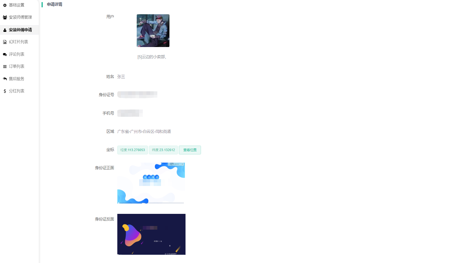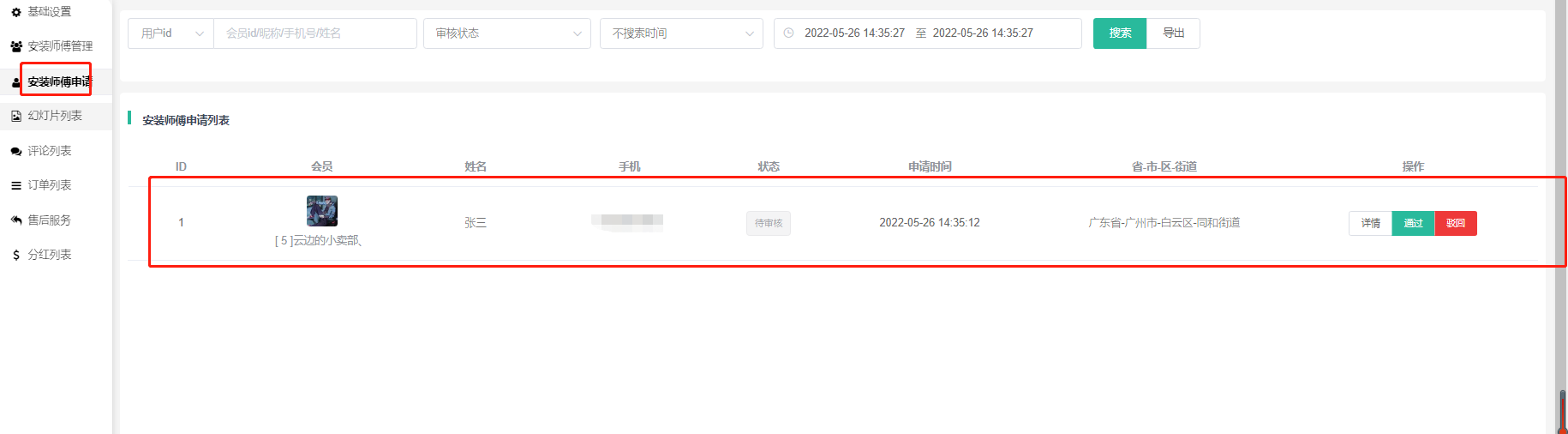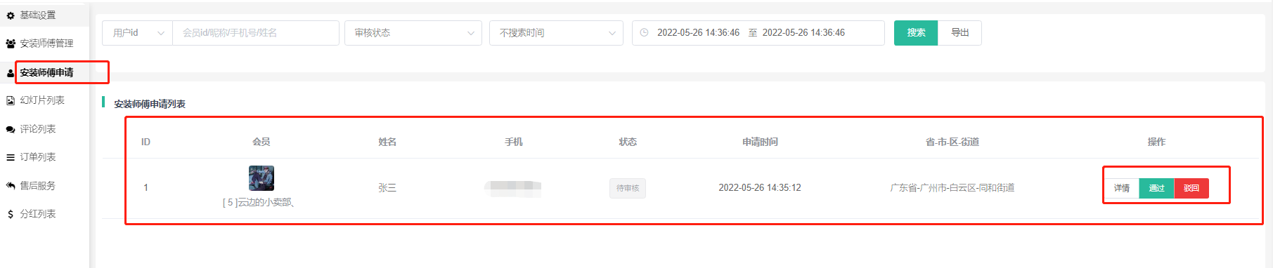 1、 会员在会员中心申请成为安装师傅,填写信息点击提交后后台需要审核
