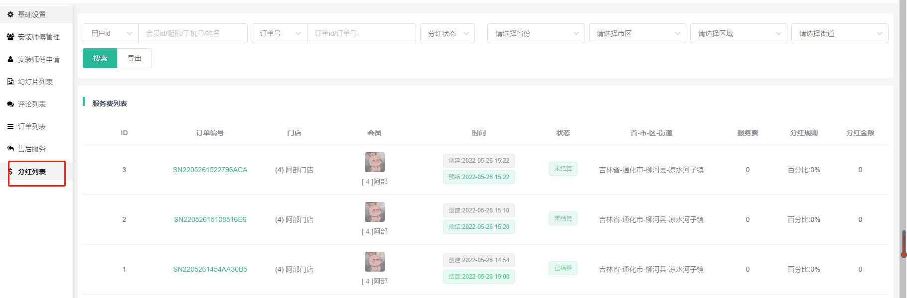 2、在此列表可查看到分红的订单、门店、会员、时间、分红状态、订单地址、服务费、分红规则、分红金额