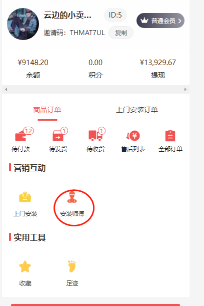 10、会员成为安装师傅后还可在推广中心查看到上门安装入口,点击进入可查看到分红情况