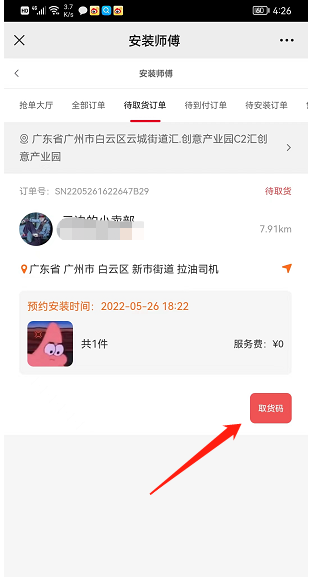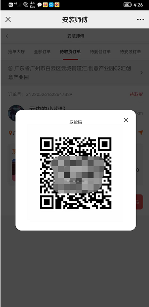 3 )待取货:安装师傅在前台抢单大厅抢单成功或者后台已经把订单分配给了安装师傅,但是安装师傅还没取货