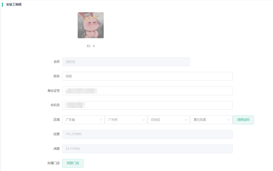 1)添加安装师傅,选择会员(只能选择团队下的会员),设置安装师傅信息,点击保存(门店独立后台添加的安装师傅属于该门店)