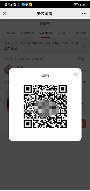 7、取货后可点击上门安装(订单提交时选择货到付款的订单在订单详情页会显示一个收款码,下单会员扫码支付)