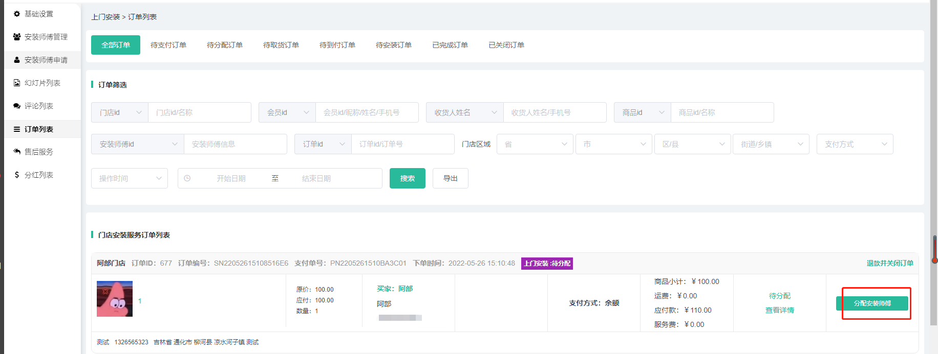 4、在订单列表可分配/修改安装师傅(可选择所有安装师傅,不区分门店)